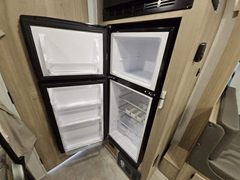 This spacious bunk trailer will work perfectly for a family or friend group that enjoys their own sleeping space, plus more floor space with the dinette slide out that can sleep one to two. The bottom bunk even flips up so you can stow away your bikes, totes and such through the bike door for secure travels. There is exterior storage for more outdoor gear, and interior storage found throughout. The cook will love having a pantry and overhead cabinets for snacks, canned goods, dishes and more. After making a warm meal, the 12V refrigerator can hold the leftovers. There is also a flip-down lavy sink in the full bath for added space when not in use!