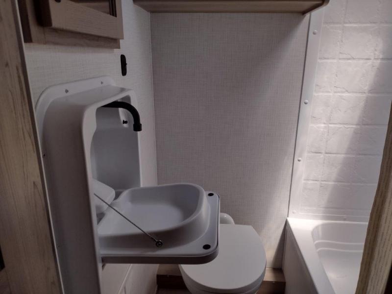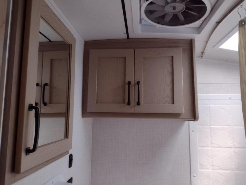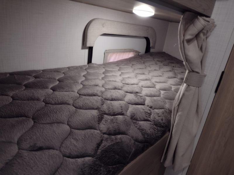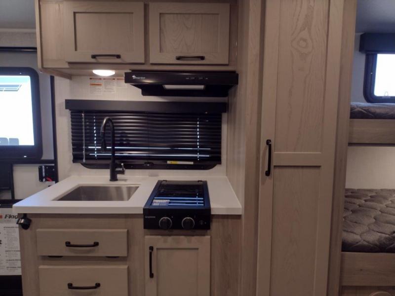 This spacious bunk trailer will work perfectly for a family or friend group that enjoys their own sleeping space, plus more floor space with the dinette slide out that can sleep one to two. The bottom bunk even flips up so you can stow away your bikes, totes and such through the bike door for secure travels. There is exterior storage for more outdoor gear, and interior storage found throughout. The cook will love having a pantry and overhead cabinets for snacks, canned goods, dishes and more. After making a warm meal, the 12V refrigerator can hold the leftovers. There is also a flip-down lavy sink in the full bath for added space when not in use!