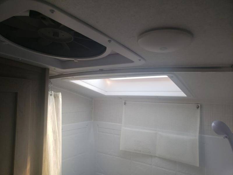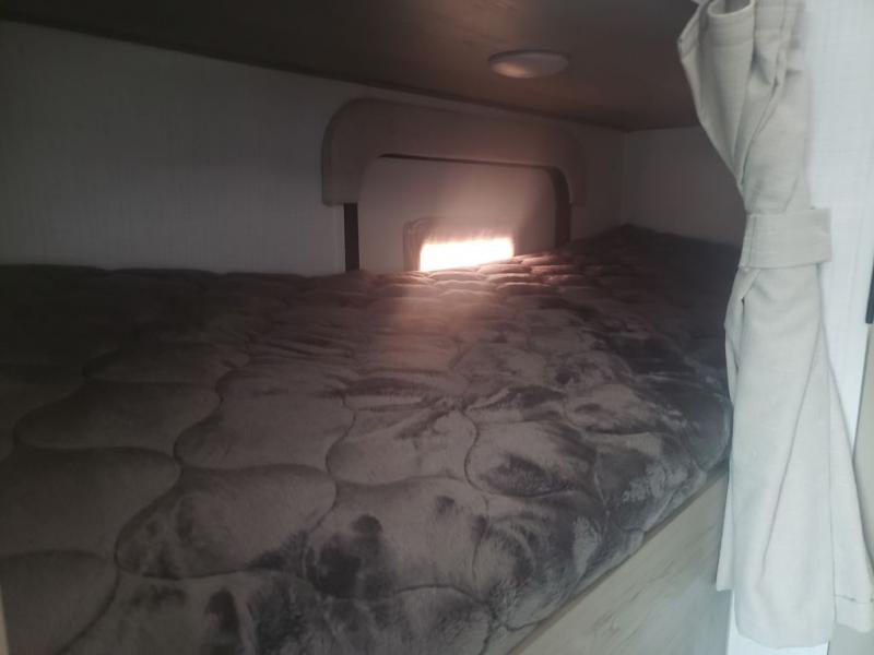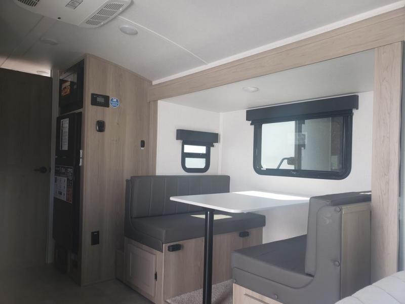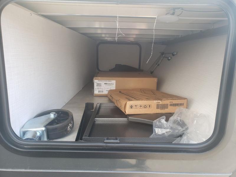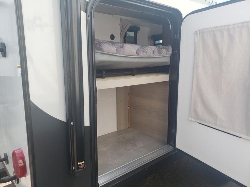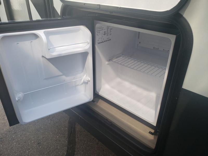 This spacious bunk trailer will work perfectly for a family or friend group that enjoys their own sleeping space, plus more floor space with the dinette slide out that can sleep one to two. The bottom bunk even flips up so you can stow away your bikes, totes and such through the bike door for secure travels. There is exterior storage for more outdoor gear, and interior storage found throughout. The cook will love having a pantry and overhead cabinets for snacks, canned goods, dishes and more. After making a warm meal, the 12V refrigerator can hold the leftovers. There is also a flip-down lavy sink in the full bath for added space when not in use!