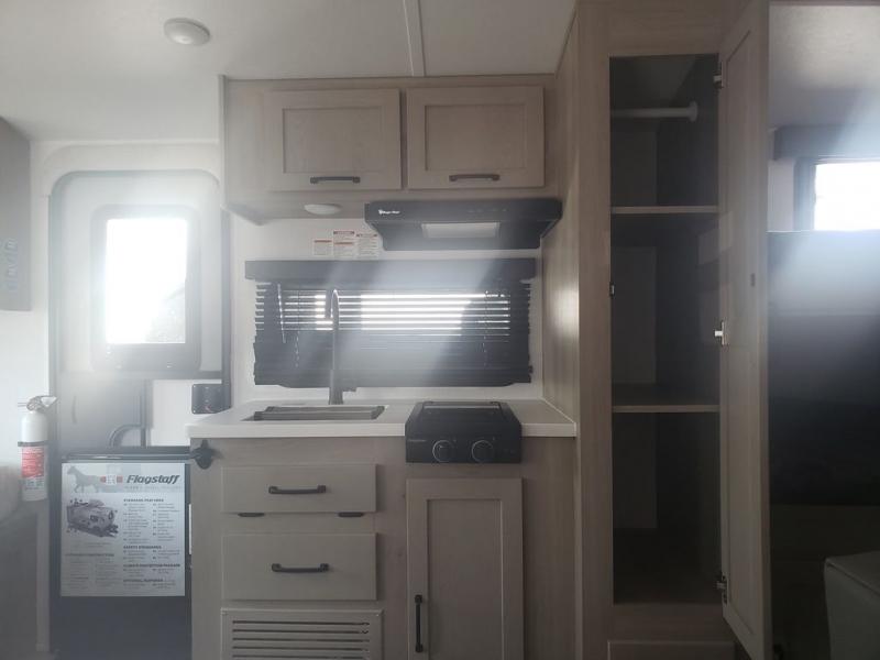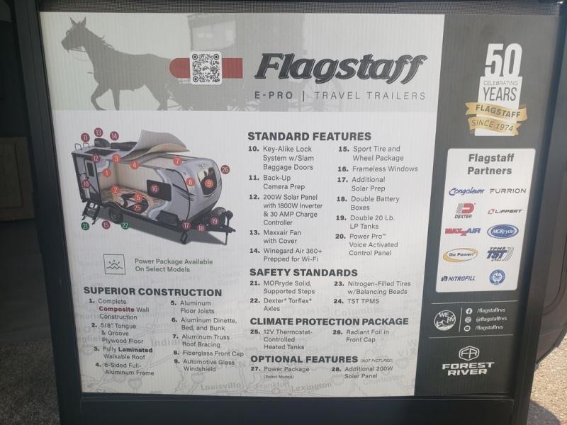 With any Flagstaff E-Pro travel trailer by Forest River, you will experience lightweight towing, style and features that will meet your needs, plus amenities that give you more than you expected! Built with interior and exterior composite sidewall construction, tongue and grove plywood flooring, and a vacuum laminated roof and walls, plus torsion axle, Rubber-Ryde suspension, and a tire pressure monitoring system for safety while traveling. And the 200 watt roof mount solar panel with 1,800-watt inverter will allow you to stay off-grid if you like. The interior offers a comfortable environment with the choice to use the air conditioner or furnace, and a 12V entertainment TV with a stereo to stay up to date on your favorite movies. Make your selection today!