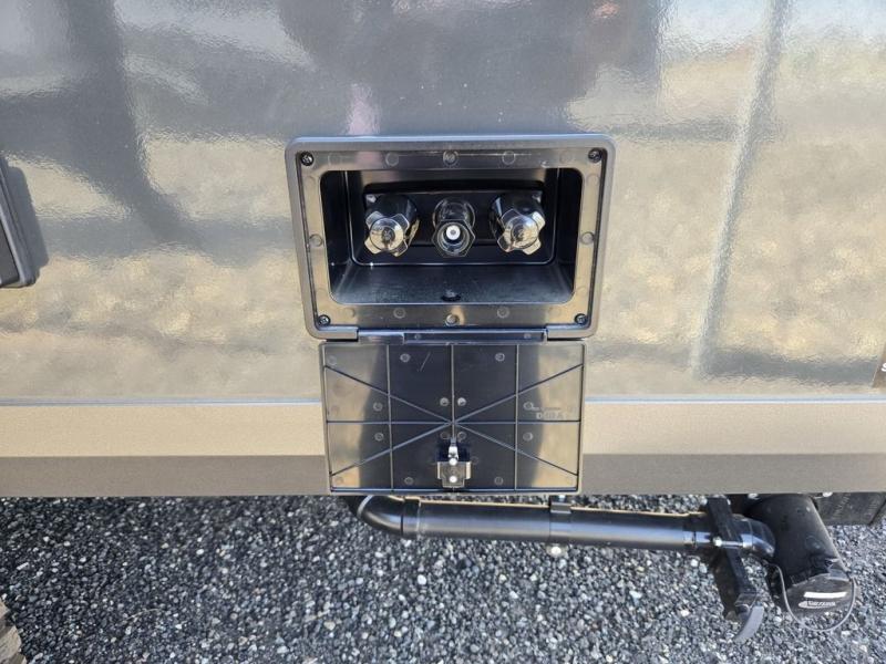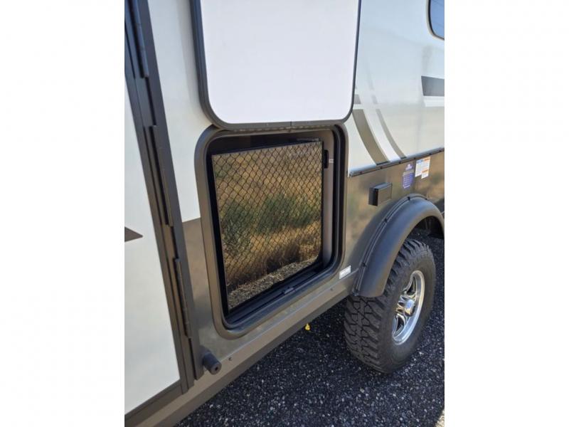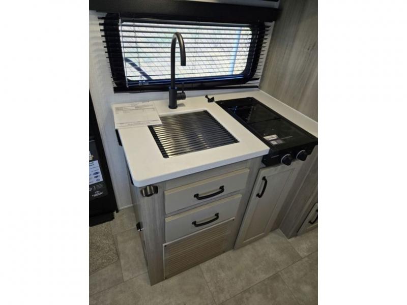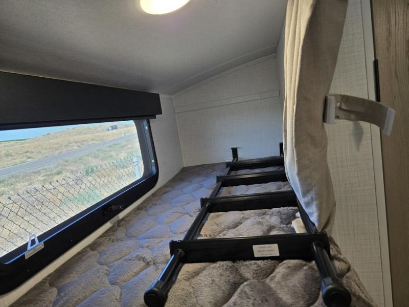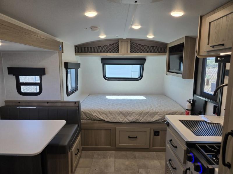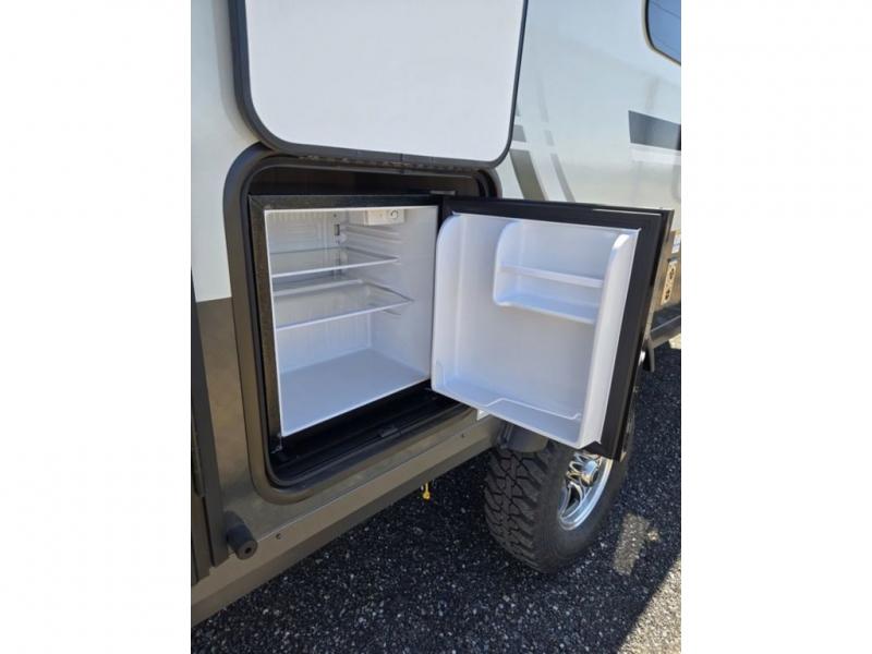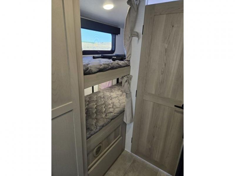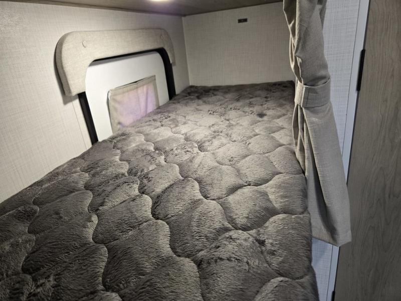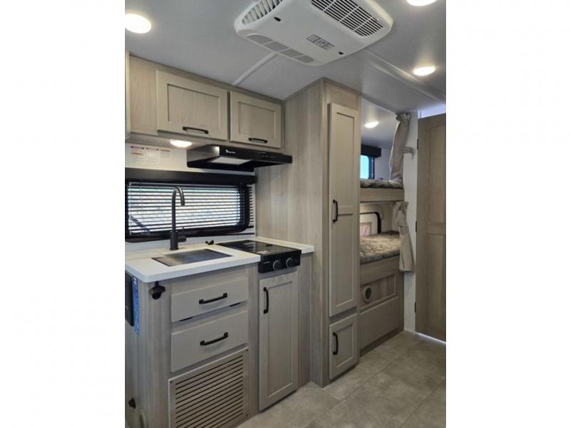 This spacious bunk trailer will work perfectly for a family or friend group that enjoys their own sleeping space, plus more floor space with the dinette slide out that can sleep one to two. The bottom bunk even flips up so you can stow away your bikes, totes and such through the bike door for secure travels. There is exterior storage for more outdoor gear, and interior storage found throughout. The cook will love having a pantry and overhead cabinets for snacks, canned goods, dishes and more. After making a warm meal, the 12V refrigerator can hold the leftovers. There is also a flip-down lavy sink in the full bath for added space when not in use!