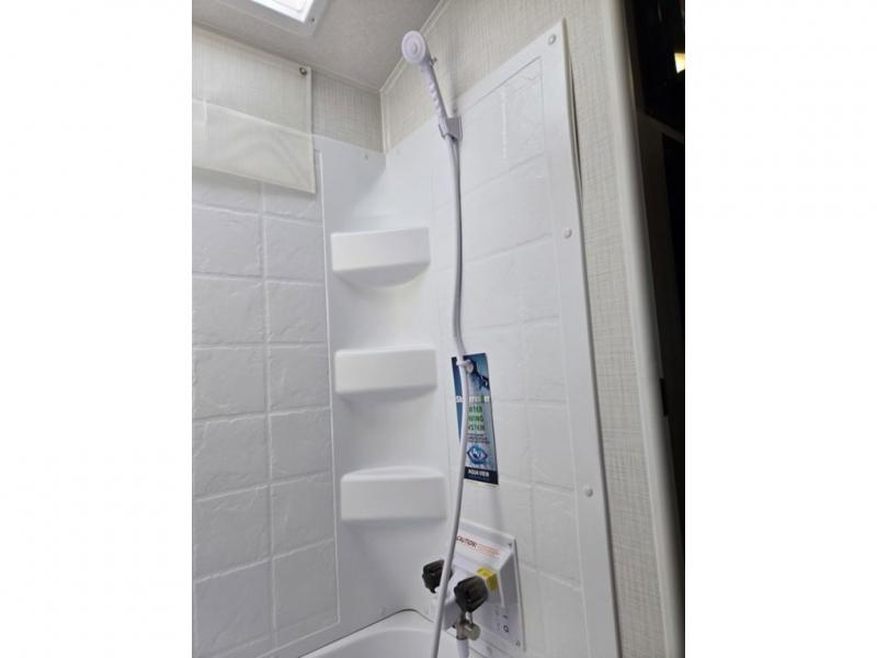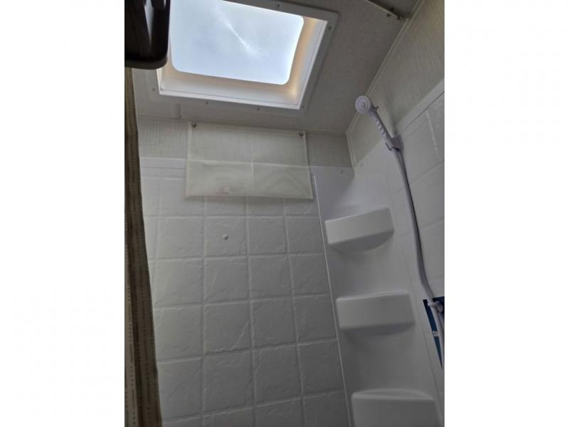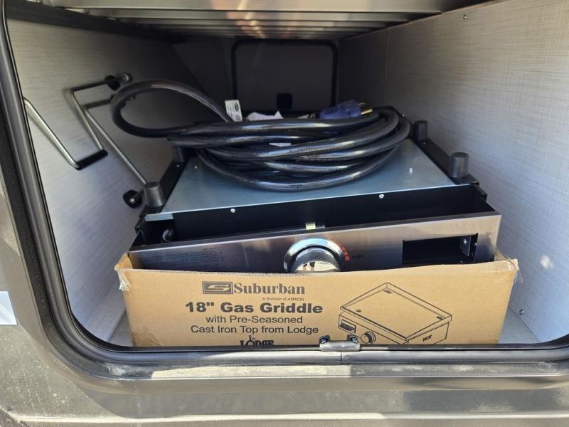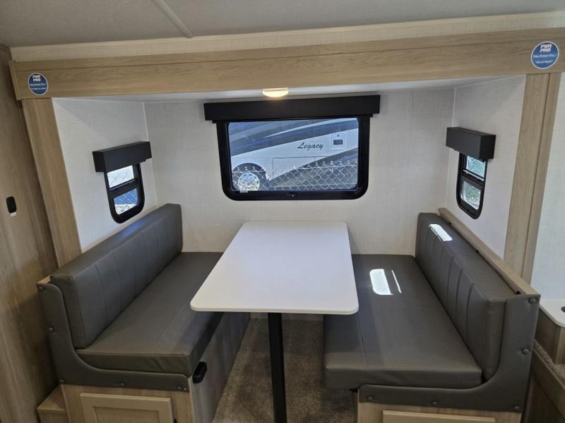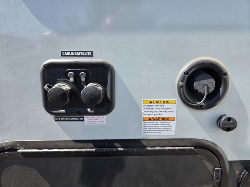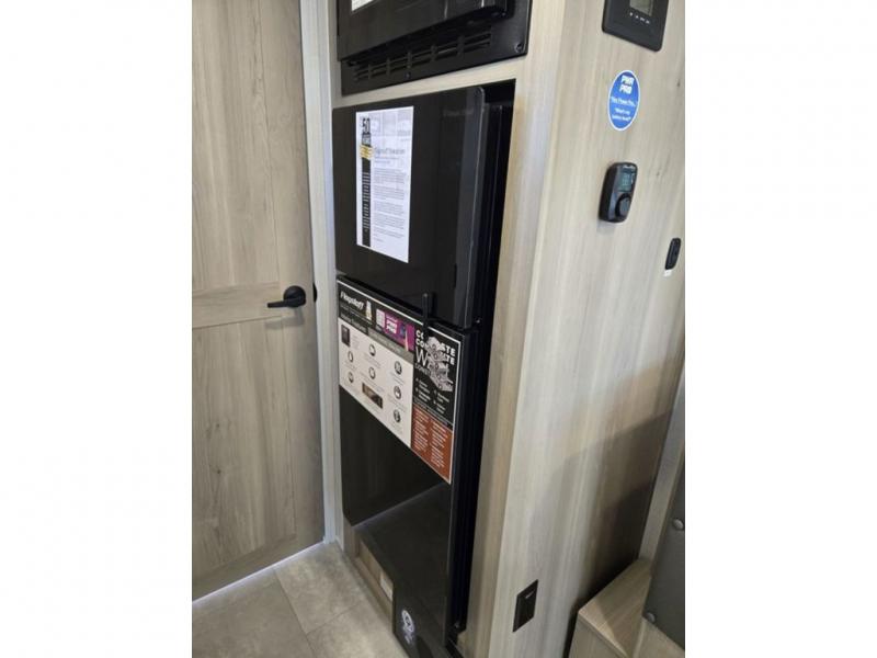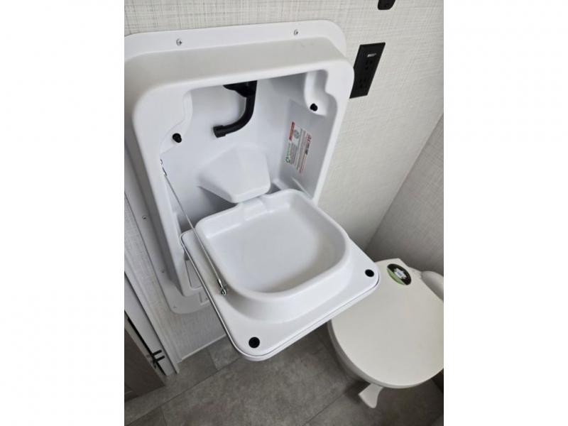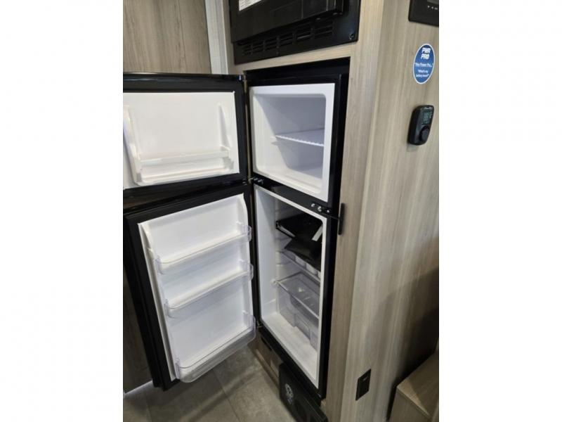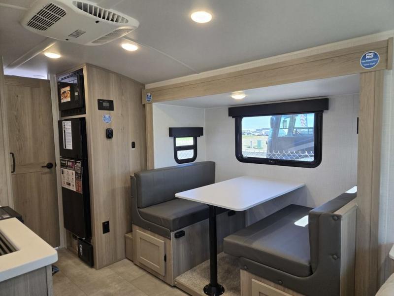 This spacious bunk trailer will work perfectly for a family or friend group that enjoys their own sleeping space, plus more floor space with the dinette slide out that can sleep one to two. The bottom bunk even flips up so you can stow away your bikes, totes and such through the bike door for secure travels. There is exterior storage for more outdoor gear, and interior storage found throughout. The cook will love having a pantry and overhead cabinets for snacks, canned goods, dishes and more. After making a warm meal, the 12V refrigerator can hold the leftovers. There is also a flip-down lavy sink in the full bath for added space when not in use!
