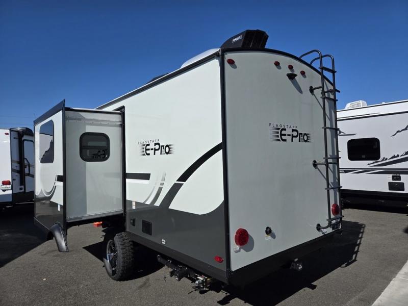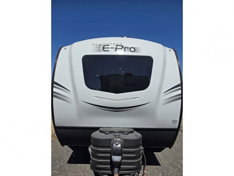 With any Flagstaff E-Pro travel trailer by Forest River, you will experience lightweight towing, style and features that will meet your needs, plus amenities that give you more than you expected! Built with interior and exterior composite sidewall construction, tongue and grove plywood flooring, and a vacuum laminated roof and walls, plus torsion axle, Rubber-Ryde suspension, and a tire pressure monitoring system for safety while traveling. And the 200 watt roof mount solar panel with 1,800-watt inverter will allow you to stay off-grid if you like. The interior offers a comfortable environment with the choice to use the air conditioner or furnace, and a 12V entertainment TV with a stereo to stay up to date on your favorite movies. Make your selection today!