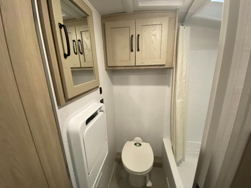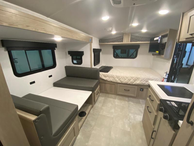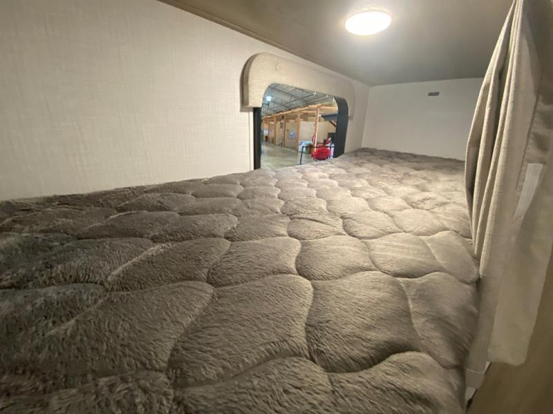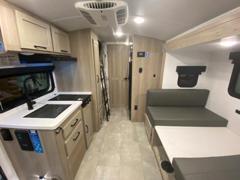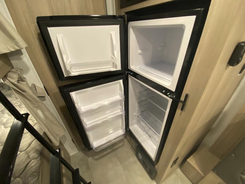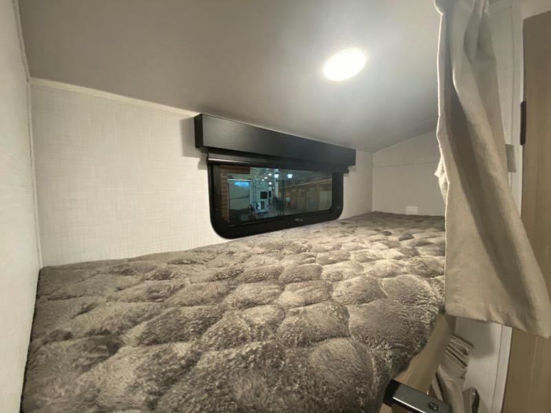 This spacious bunk trailer will work perfectly for a family or friend group that enjoys their own sleeping space, plus more floor space with the dinette slide out that can sleep one to two. The bottom bunk even flips up so you can stow away your bikes, totes and such through the bike door for secure travels. There is exterior storage for more outdoor gear, and interior storage found throughout. The cook will love having a pantry and overhead cabinets for snacks, canned goods, dishes and more. After making a warm meal, the 12V refrigerator can hold the leftovers. There is also a flip-down lavy sink in the full bath for added space when not in use!