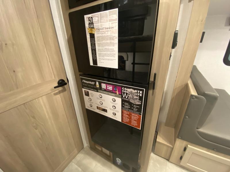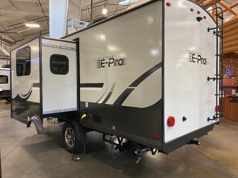 With any Flagstaff E-Pro travel trailer by Forest River, you will experience lightweight towing, style and features that will meet your needs, plus amenities that give you more than you expected! Built with interior and exterior composite sidewall construction, tongue and grove plywood flooring, and a vacuum laminated roof and walls, plus torsion axle, Rubber-Ryde suspension, and a tire pressure monitoring system for safety while traveling. And the 200 watt roof mount solar panel with 1,800-watt inverter will allow you to stay off-grid if you like. The interior offers a comfortable environment with the choice to use the air conditioner or furnace, and a 12V entertainment TV with a stereo to stay up to date on your favorite movies. Make your selection today!