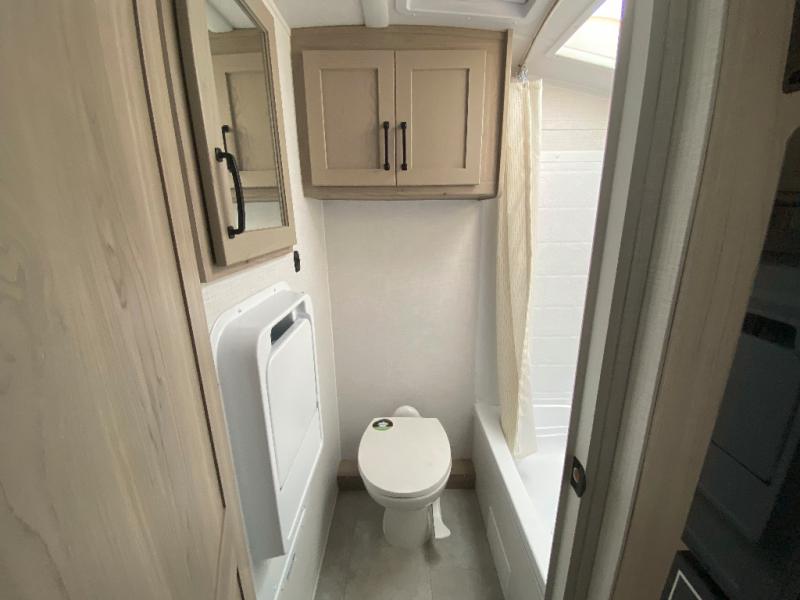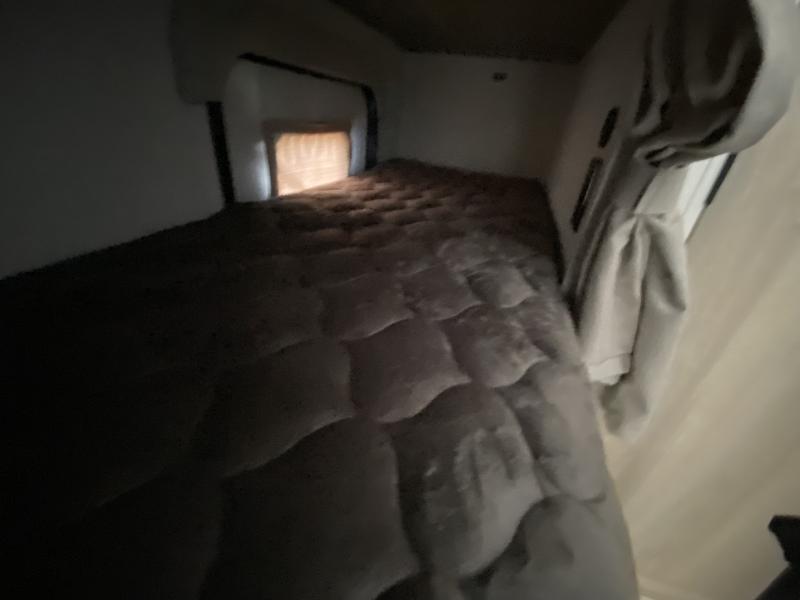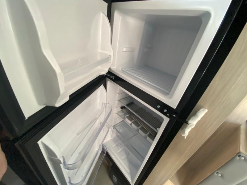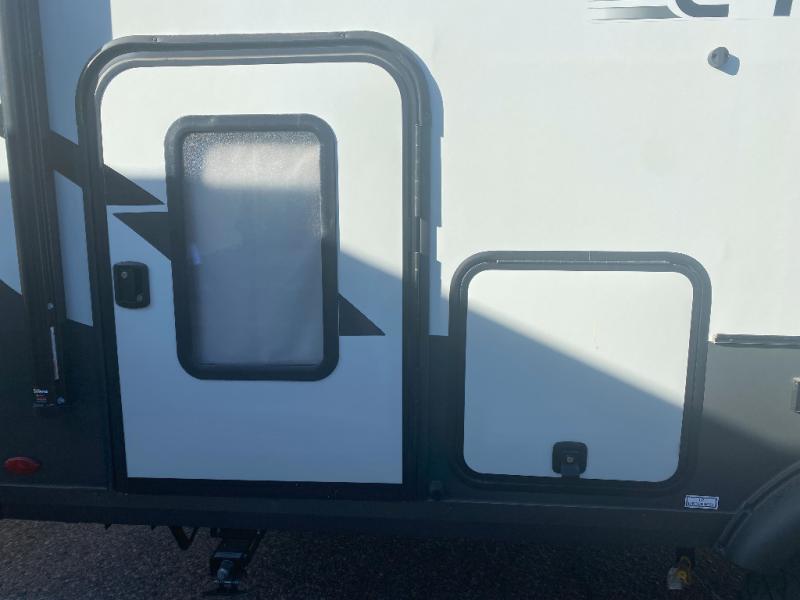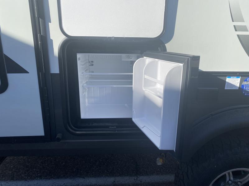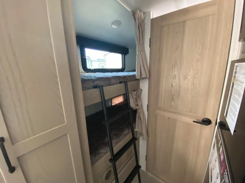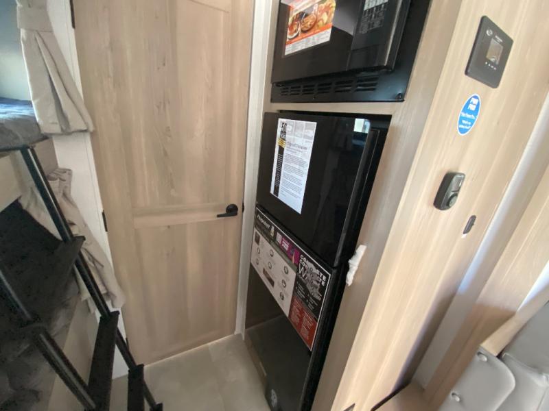 This spacious bunk trailer will work perfectly for a family or friend group that enjoys their own sleeping space, plus more floor space with the dinette slide out that can sleep one to two. The bottom bunk even flips up so you can stow away your bikes, totes and such through the bike door for secure travels. There is exterior storage for more outdoor gear, and interior storage found throughout. The cook will love having a pantry and overhead cabinets for snacks, canned goods, dishes and more. After making a warm meal, the 12V refrigerator can hold the leftovers. There is also a flip-down lavy sink in the full bath for added space when not in use!