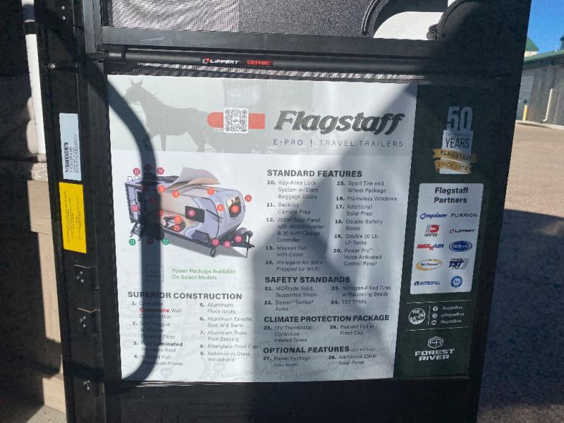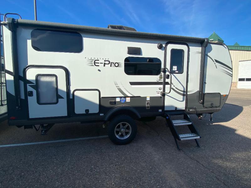With any Flagstaff E-Pro travel trailer by Forest River, you will experience lightweight towing, style and features that will meet your needs, plus amenities that give you more than you expected! Built with interior and exterior composite sidewall construction, tongue and grove plywood flooring, and a vacuum laminated roof and walls, plus torsion axle, Rubber-Ryde suspension, and a tire pressure monitoring system for safety while traveling. And the 200 watt roof mount solar panel with 1,800-watt inverter will allow you to stay off-grid if you like. The interior offers a comfortable environment with the choice to use the air conditioner or furnace, and a 12V entertainment TV with a stereo to stay up to date on your favorite movies. Make your selection today!