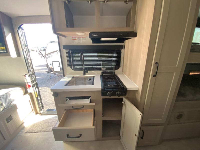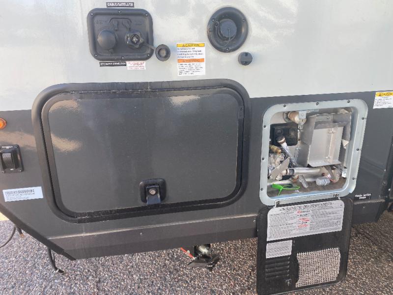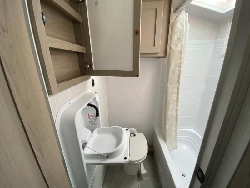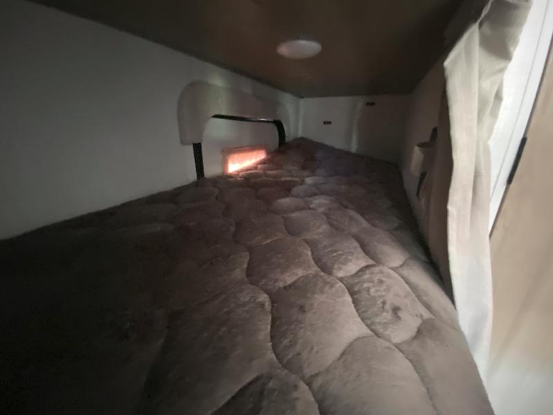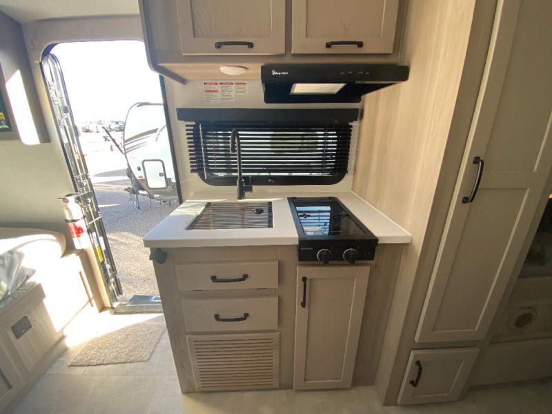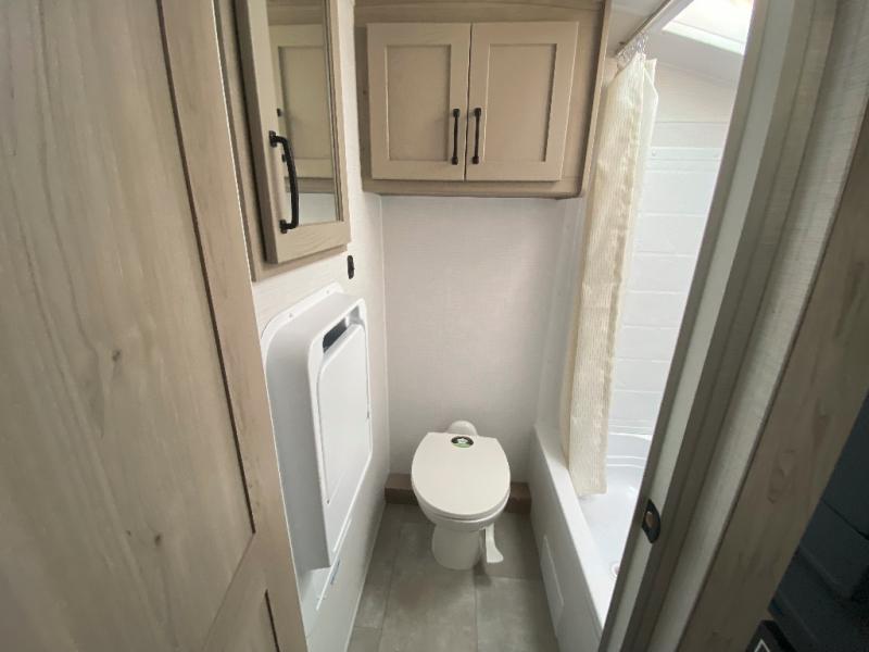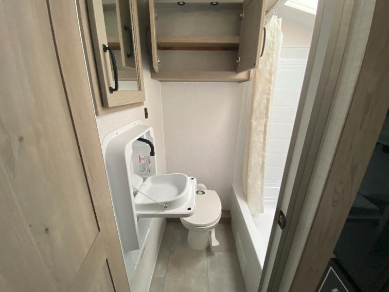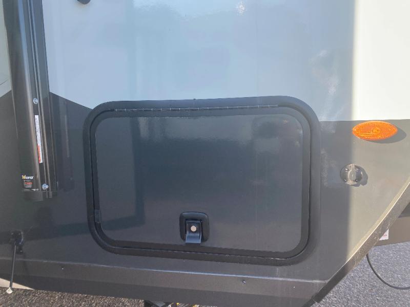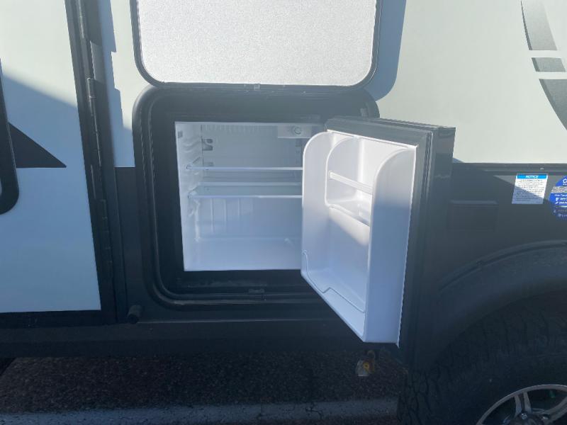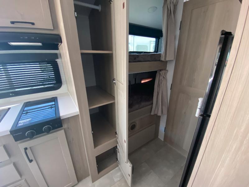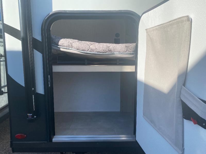 This spacious bunk trailer will work perfectly for a family or friend group that enjoys their own sleeping space, plus more floor space with the dinette slide out that can sleep one to two. The bottom bunk even flips up so you can stow away your bikes, totes and such through the bike door for secure travels. There is exterior storage for more outdoor gear, and interior storage found throughout. The cook will love having a pantry and overhead cabinets for snacks, canned goods, dishes and more. After making a warm meal, the 12V refrigerator can hold the leftovers. There is also a flip-down lavy sink in the full bath for added space when not in use!