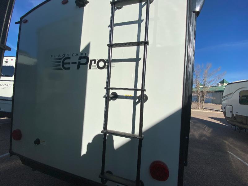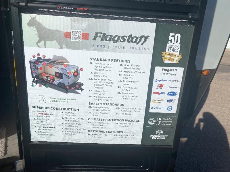 With any Flagstaff E-Pro travel trailer by Forest River, you will experience lightweight towing, style and features that will meet your needs, plus amenities that give you more than you expected! Built with interior and exterior composite sidewall construction, tongue and grove plywood flooring, and a vacuum laminated roof and walls, plus torsion axle, Rubber-Ryde suspension, and a tire pressure monitoring system for safety while traveling. And the 200 watt roof mount solar panel with 1,800-watt inverter will allow you to stay off-grid if you like. The interior offers a comfortable environment with the choice to use the air conditioner or furnace, and a 12V entertainment TV with a stereo to stay up to date on your favorite movies. Make your selection today!