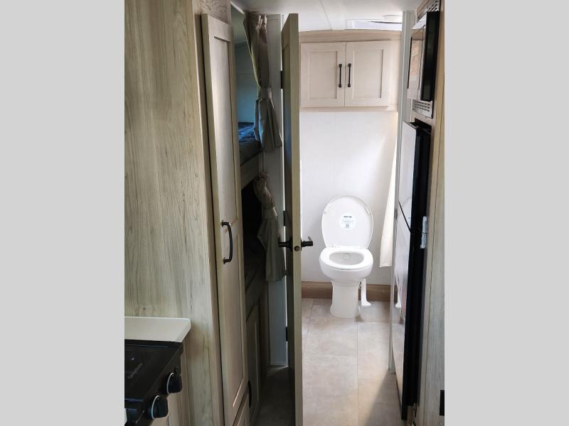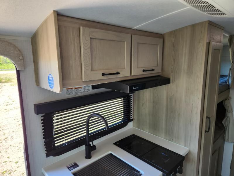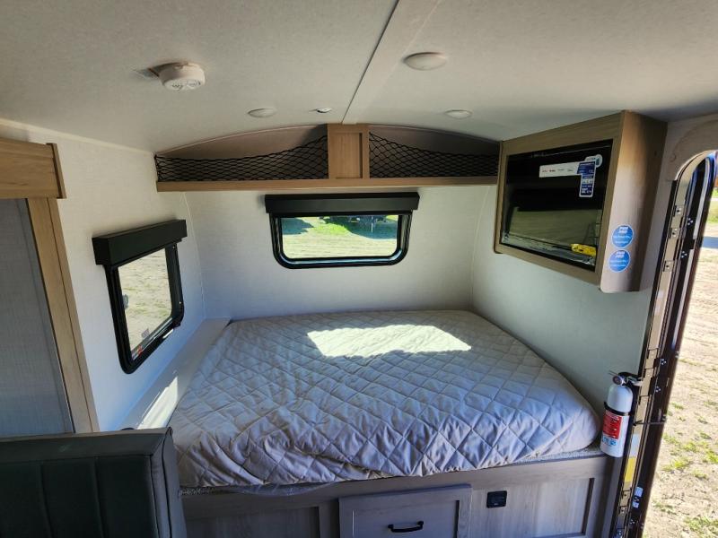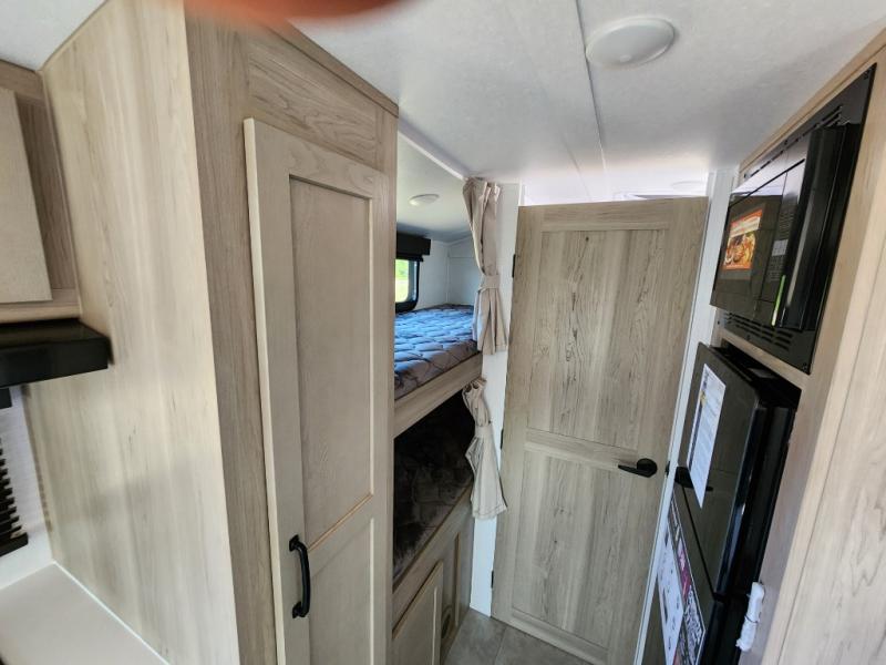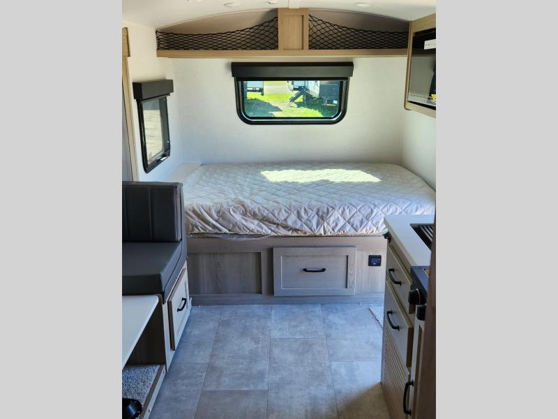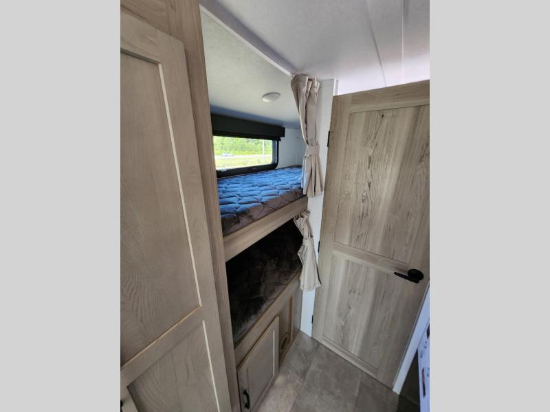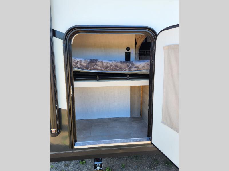 The largest bunk trailer in the E-Pro lineup will work perfectly for a family or friend group that enjoys their own sleeping space, plus more floor space with the dinette slide out that can sleep one to two. The bottom bunk even flips up so you can stow away your bikes, totes and such through the bike door for secure travels. There is exterior storage for more outdoor gear, and interior storage found throughout. The cook will love having a pantry and overhead cabinets for snacks, canned goods, dishes and more. After making a warm meal, the 12V refrigerator can hold the leftovers. The private toilet and shower/tub room gives you privacy and a place to get cleaned up after a fun day outdoors.