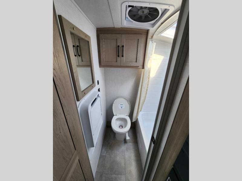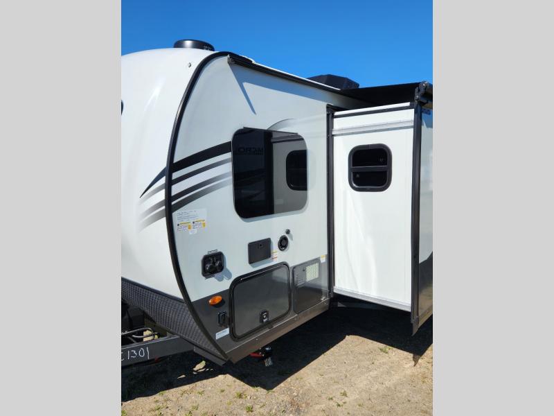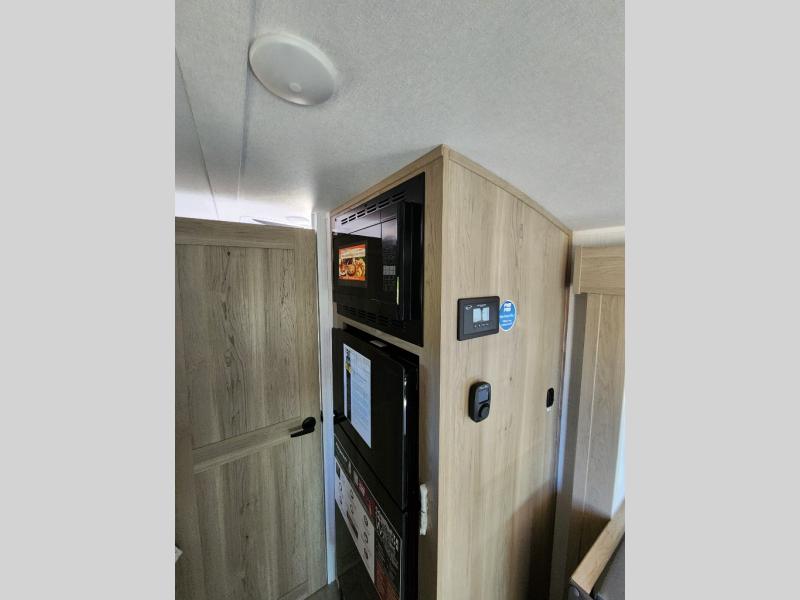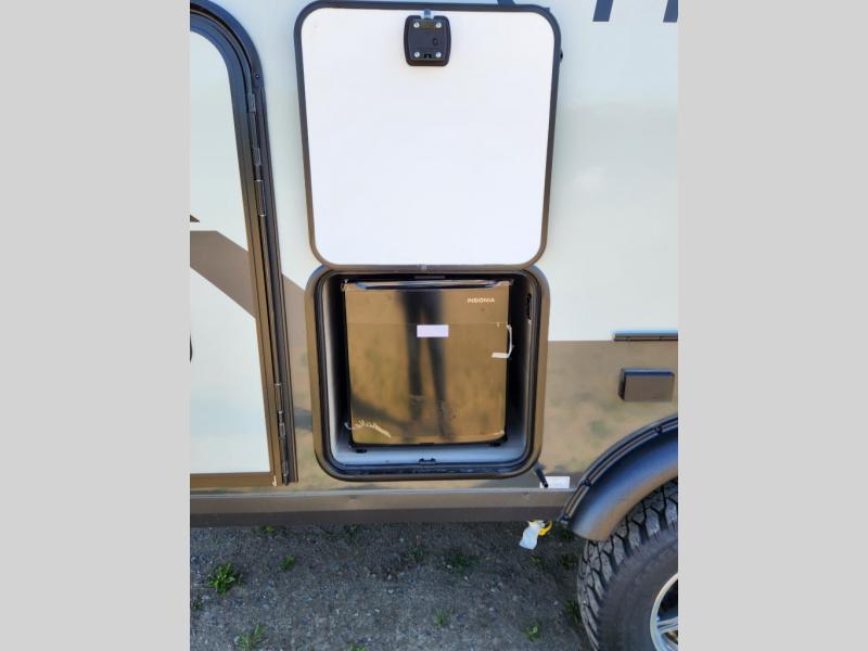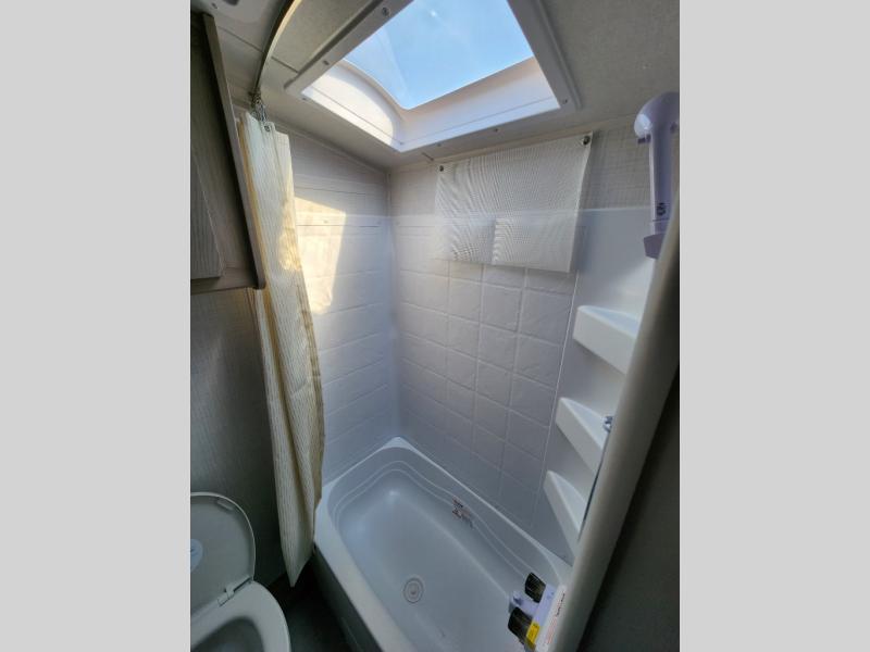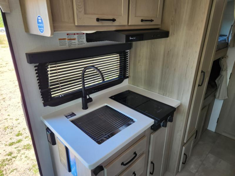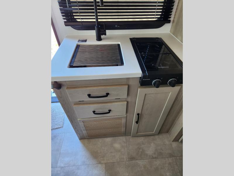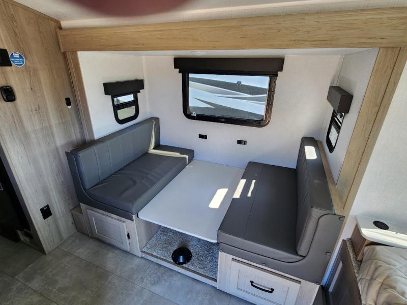 The largest bunk trailer in the E-Pro lineup will work perfectly for a family or friend group that enjoys their own sleeping space, plus more floor space with the dinette slide out that can sleep one to two. The bottom bunk even flips up so you can stow away your bikes, totes and such through the bike door for secure travels. There is exterior storage for more outdoor gear, and interior storage found throughout. The cook will love having a pantry and overhead cabinets for snacks, canned goods, dishes and more. After making a warm meal, the 12V refrigerator can hold the leftovers. The private toilet and shower/tub room gives you privacy and a place to get cleaned up after a fun day outdoors.