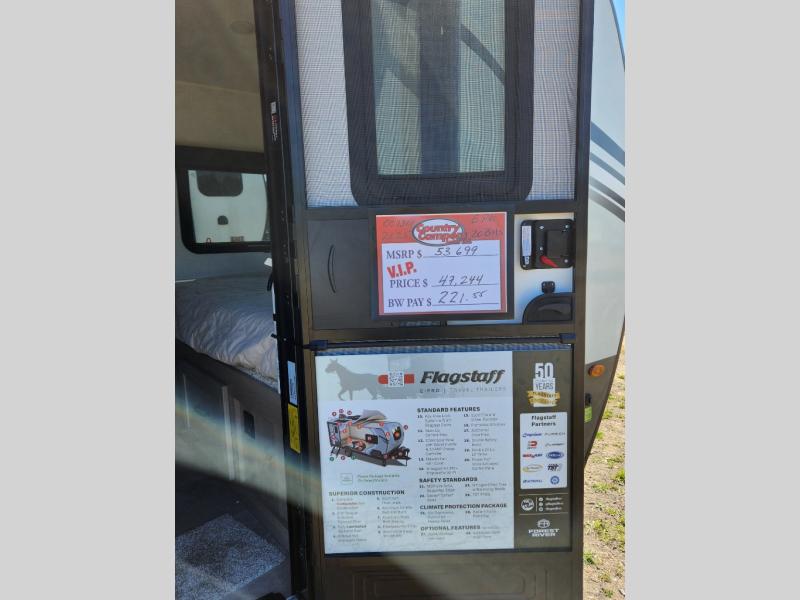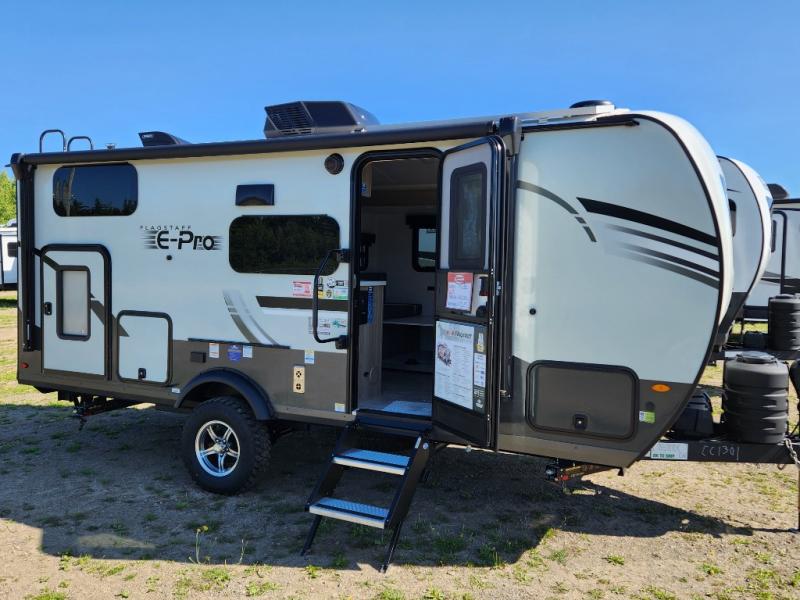 With any Flagstaff E-Pro travel trailer by Forest River, you will experience lightweight towing, style and features that will meet your needs, plus amenities that give you more than you expected! Built with interior and exterior composite sidewall construction, tongue and grove plywood flooring, and a vacuum laminated roof and walls, plus torsion axle, Rubber-Ryde suspension, and a tire pressure monitoring system for safety while traveling. And the 200 watt roof mount solar panel with 1,800-watt inverter will allow you to stay off-grid if you like. The interior offers a comfortable environment with the choice to use the air conditioner or furnace, and a 12V entertainment TV with stereo to stay up to date on your favorite movies. Make your selection today!