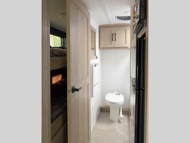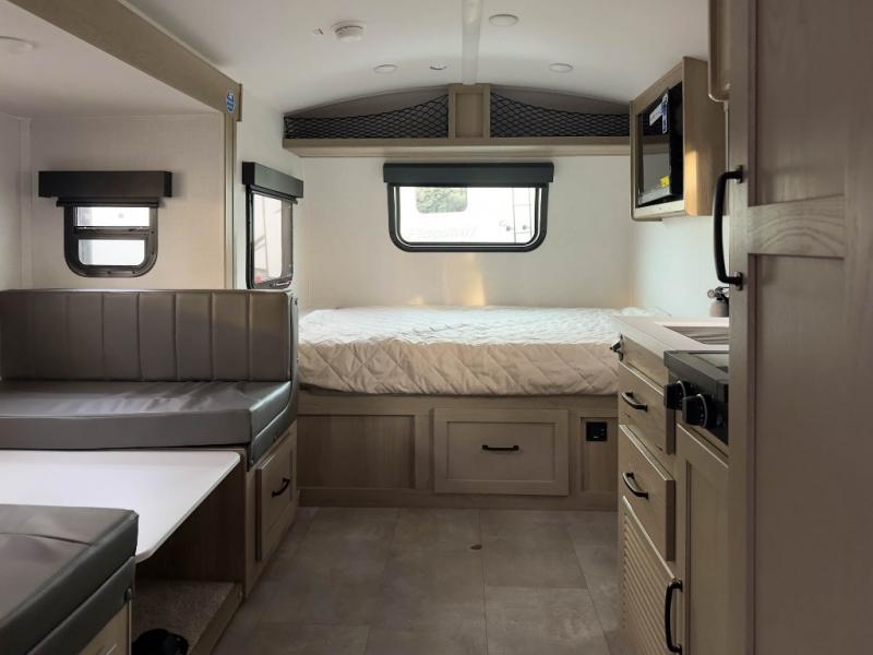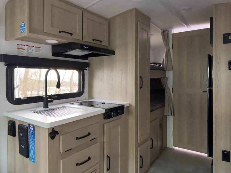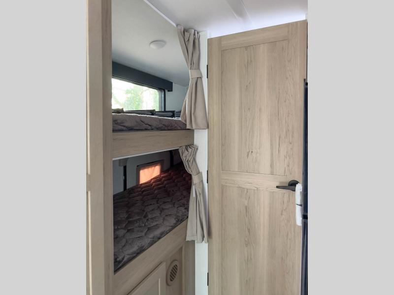 The largest bunk trailer in the E-Pro lineup will work perfectly for a family or friend group that enjoys their own sleeping space, plus more floor space with the dinette slide out that can sleep one to two. The bottom bunk even flips up so you can stow away your bikes, totes and such through the bike door for secure travels. There is exterior storage for more outdoor gear, and interior storage found throughout. The cook will love having a pantry and overhead cabinets for snacks, canned goods, dishes and more. After making a warm meal, the 12V refrigerator can hold the leftovers. The private toilet and shower/tub room gives you privacy and a place to get cleaned up after a fun day outdoors.
