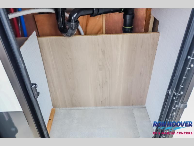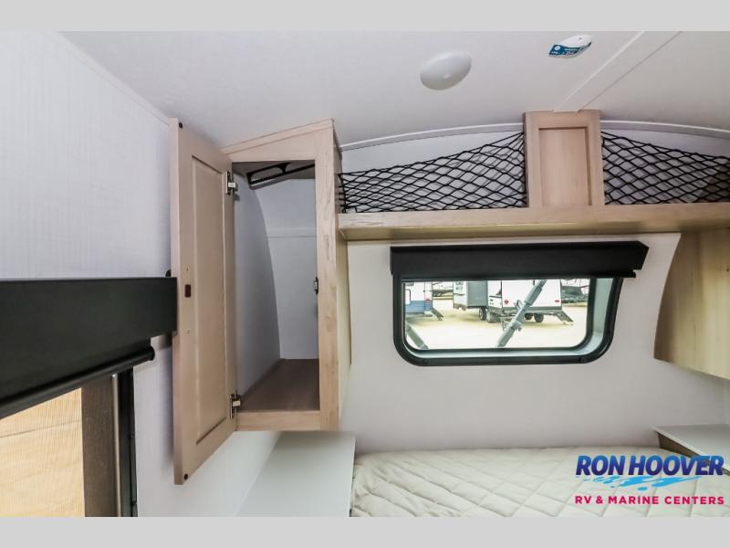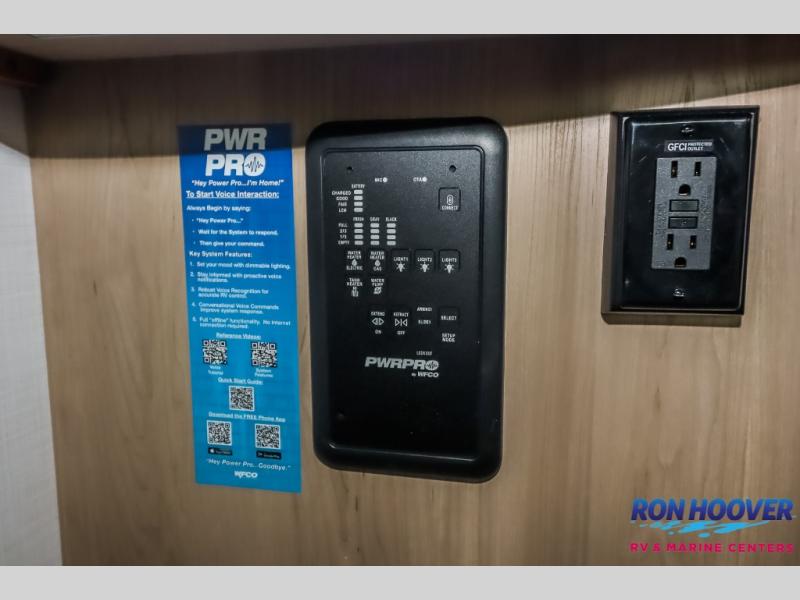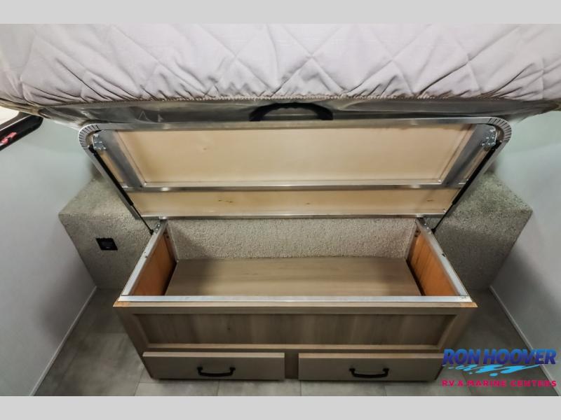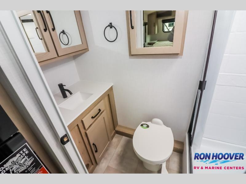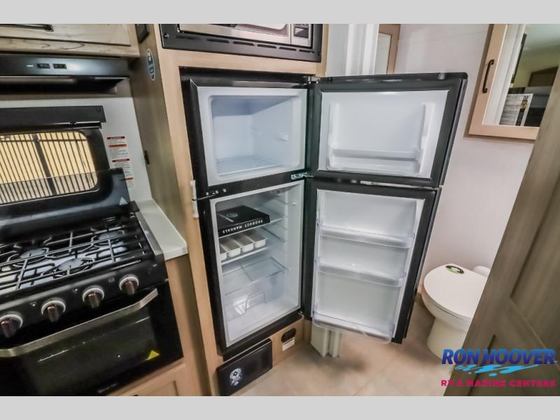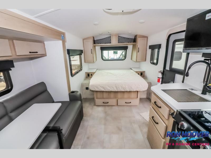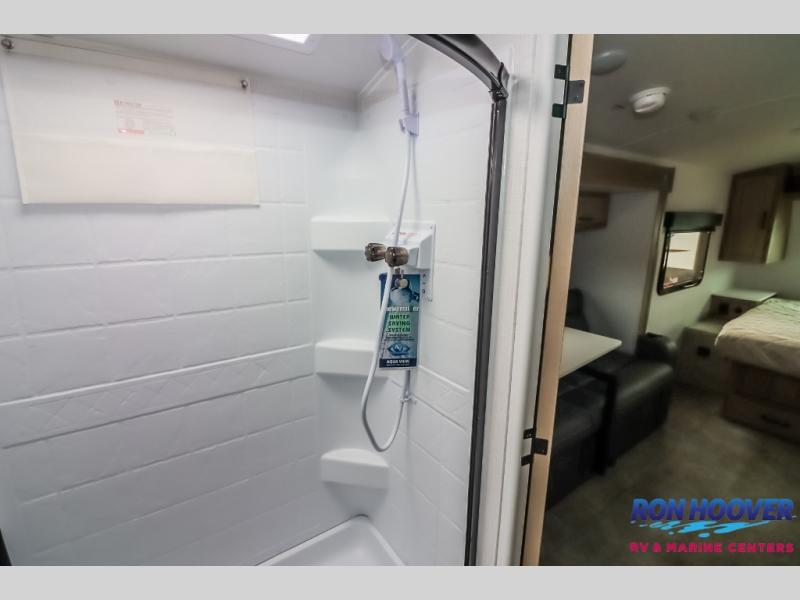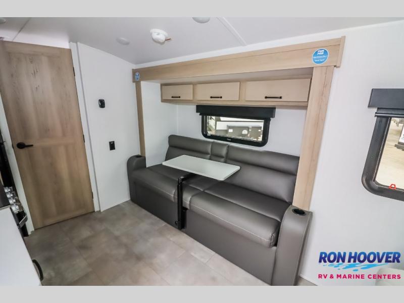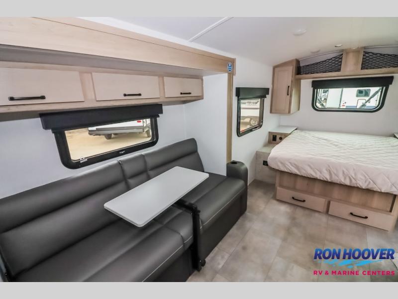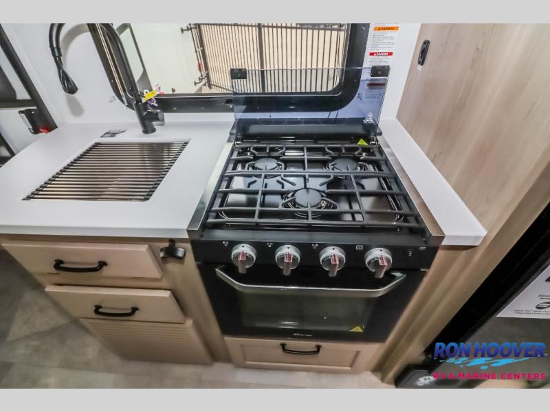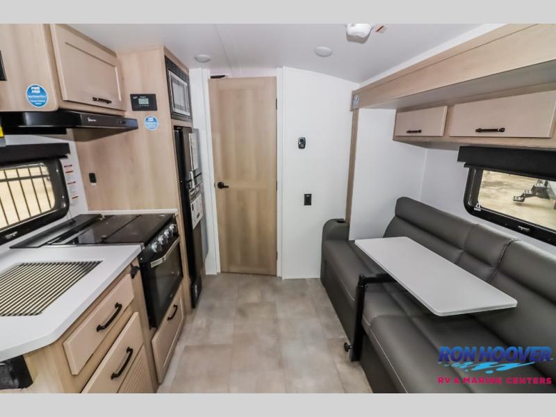 Get ready for a spacious and comfortable trip in this trailer, plus you will have a convenient rear full bathroom with an oversized shower and linen storage to utilize instead of using the campground's facilities. The walk-around full bed gives you two sides with wardrobes to claim as your own. And the kitchen offers full amenities to make meals, and the outside griddle gives you even more choices when cooking. You can relax, dine, or even work from the slide out sofa with a 30" x 15" table and watch the 32" TV. You will find storage along the exterior for your outdoor gear, plus a 14' power awning.