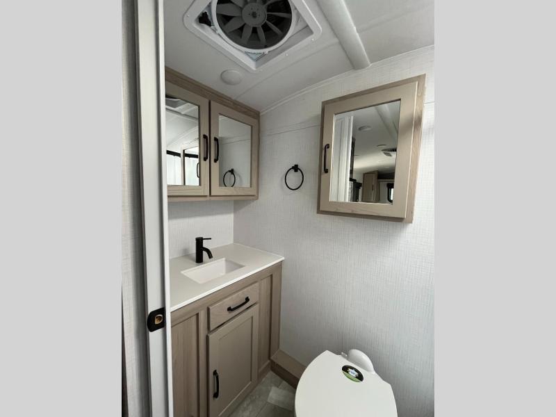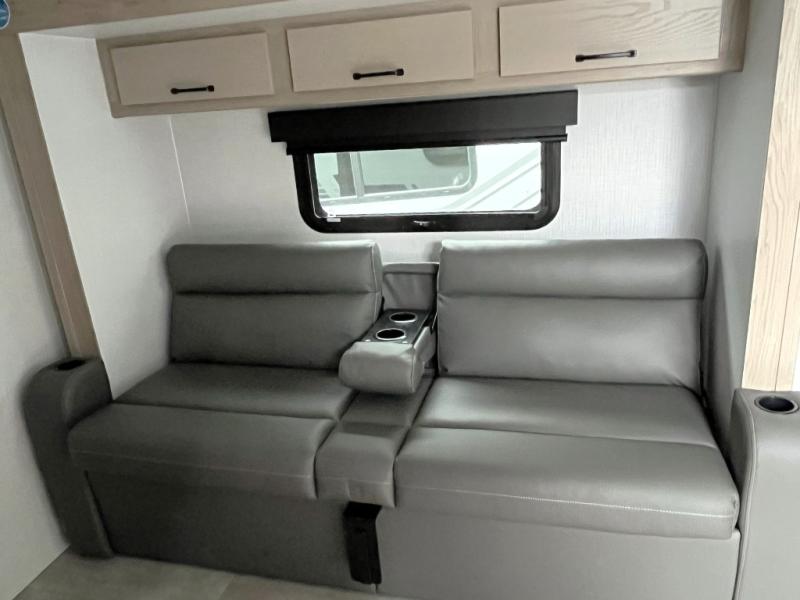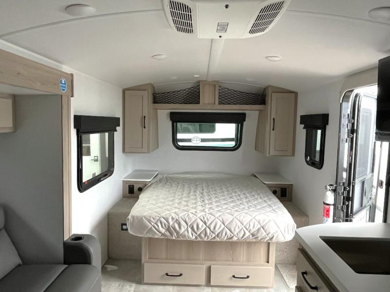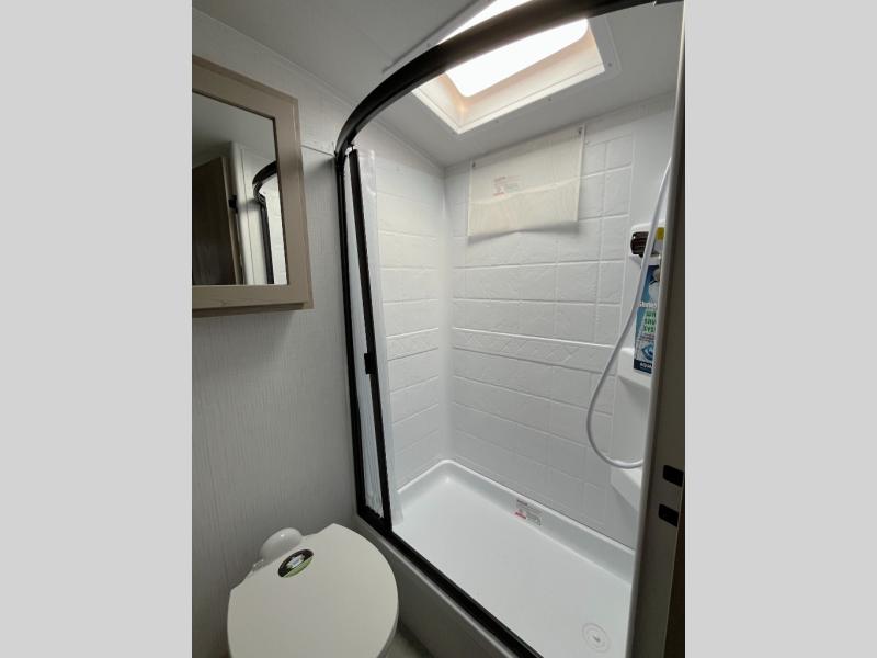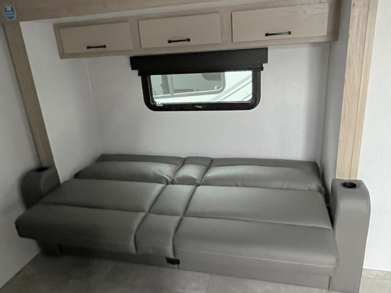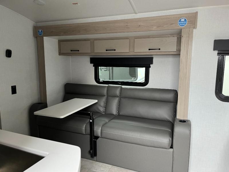Get ready for a spacious and comfortable trip in this trailer, plus you will have a convenient rear full bathroom with an oversized shower and linen storage to utilize instead of using the campground's facilities. The walk-around full bed gives you two sides with wardrobes to claim as your own. And the kitchen offers full amenities to make meals, and the outside griddle gives you even more choices when cooking. You can relax, dine, or even work from the slide out sofa with a 30" x 15" table and watch the 32" TV. You will find storage along the exterior for your outdoor gear, plus a 14' power awning.