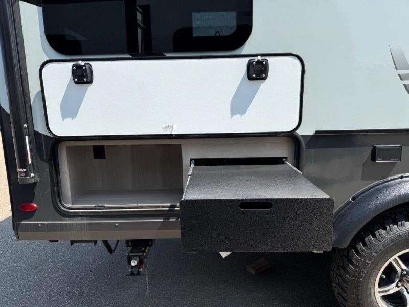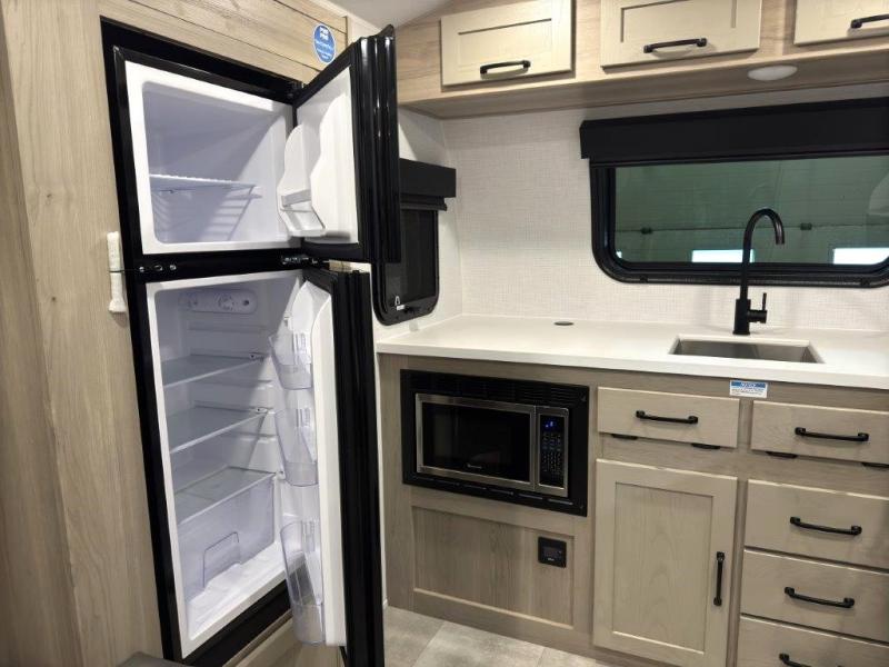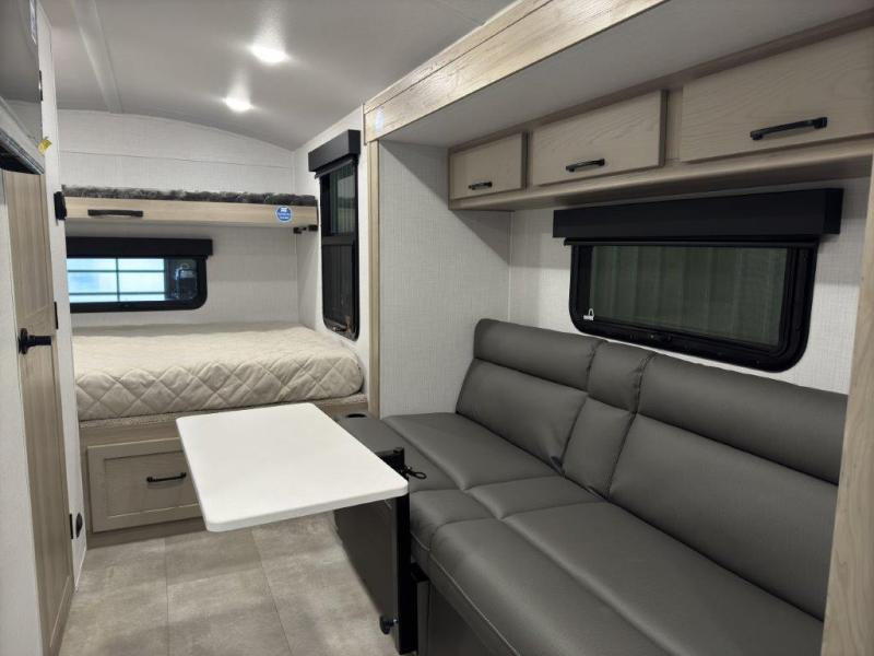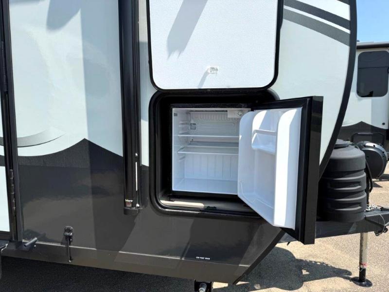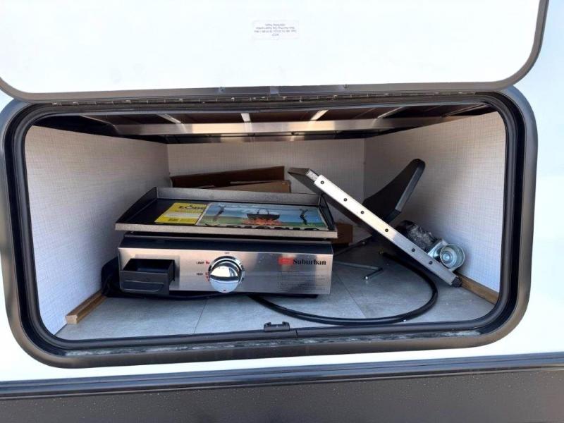 The chef will love cooking in the front kitchen of this travel trailer! It offers plenty of countertop space to meal prep and all of the essentials to cook delicious meals, plus there is even an outside kitchen with a refrigerator, a pull-out stove, and a griddle to fry what you caught that day. Enjoy all of your meals at the 72" sofa slide with a table or pull up a table and chairs under the 15' power awning. The queen bed offers a comfortable place for you to rest up each night and it even has a 26" x 80" flip-up bunk above it for a guest or two to tag along. Store all of your camping essentials in the exterior storage and rinse your feet off with the outside spray port after a fun day at the beach!