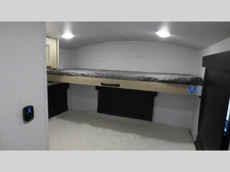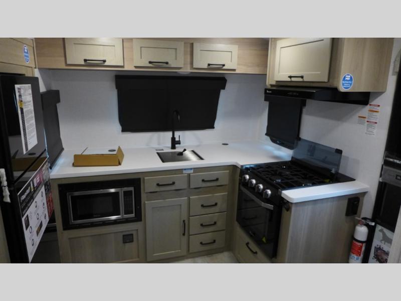 The chef will love cooking in the front kitchen of this travel trailer! It offers plenty of countertop space to meal prep and all of the essentials to cook delicious meals, plus there is even an outside kitchen with a refrigerator, a pull-out stove, and a griddle to fry what you caught that day. Enjoy all of your meals at the 72" sofa slide with a table or pull up a table and chairs under the 15' power awning. The queen bed offers a comfortable place for you to rest up each night and it even has a 26" x 80" flip-up bunk above it for a guest or two to tag along. Store all of your camping essentials in the exterior storage and rinse your feet off with the outside spray port after a fun day at the beach!