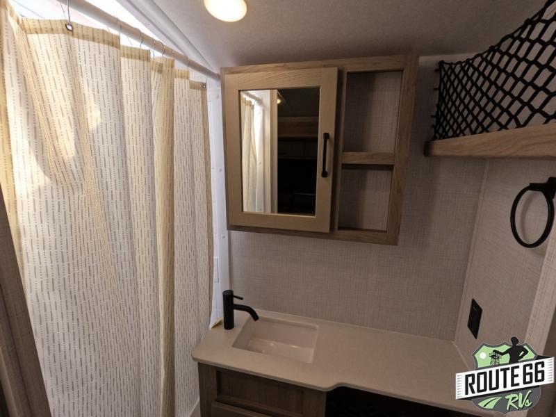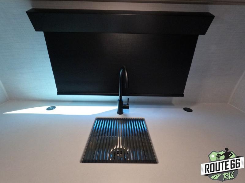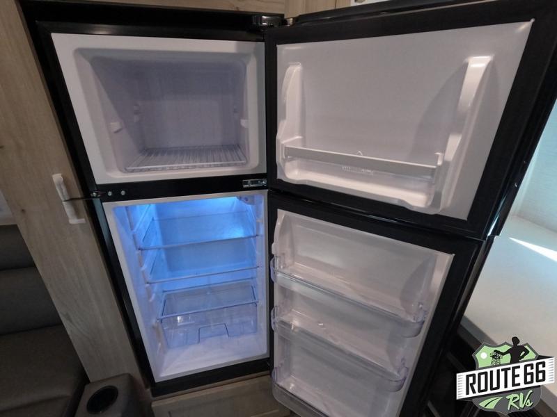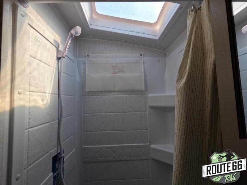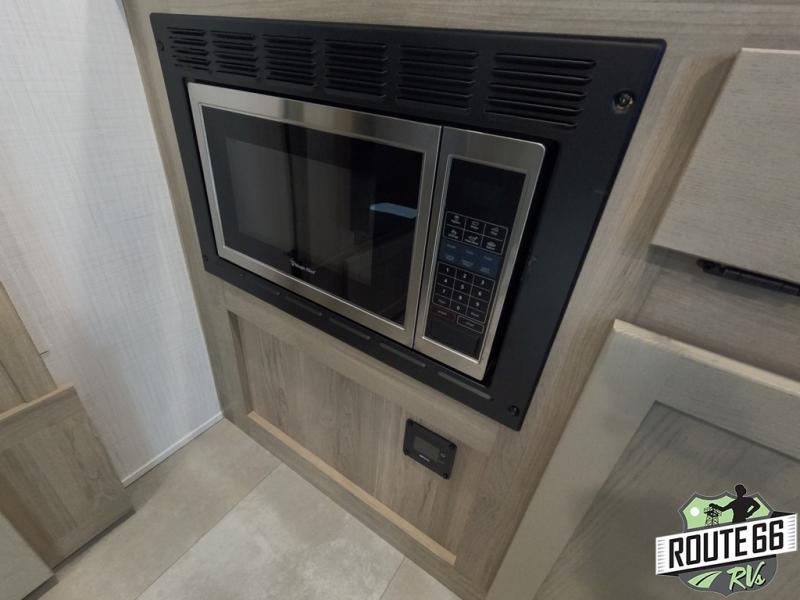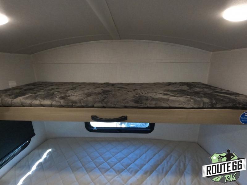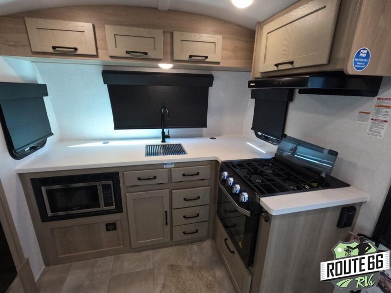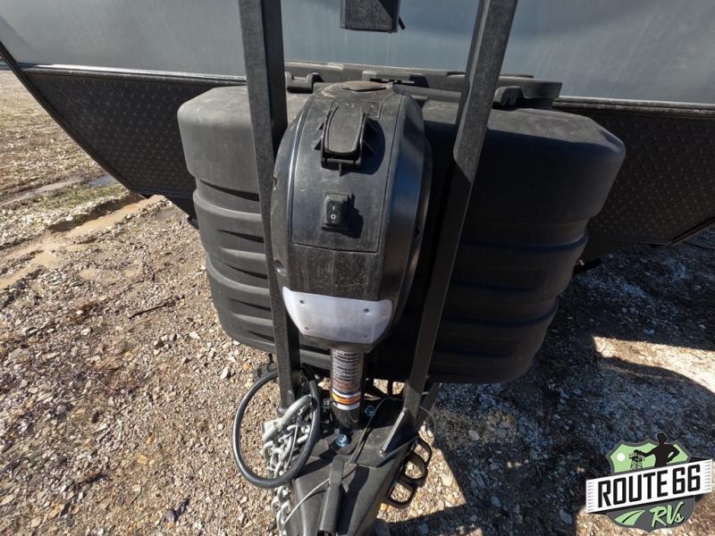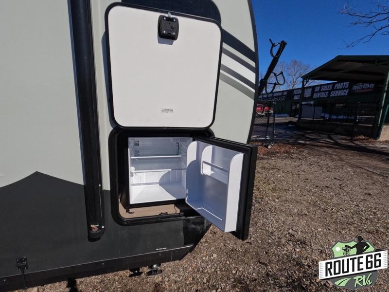 The chef will love cooking in the front kitchen of this travel trailer! It offers plenty of countertop space to meal prep and all of the essentials to cook delicious meals, plus there is even an outside kitchen with a refrigerator, a pull-out stove, and a griddle to fry what you caught that day. Enjoy all of your meals at the 72" sofa slide with a table or pull up a table and chairs under the 15' power awning. The queen bed offers a comfortable place for you to rest up each night and it even has a 26" x 80" flip-up bunk above it for a guest or two to tag along. Store all of your camping essentials in the exterior storage and rinse your feet off with the outside spray port after a fun day at the beach!