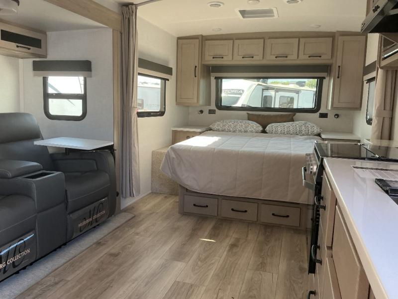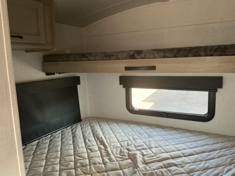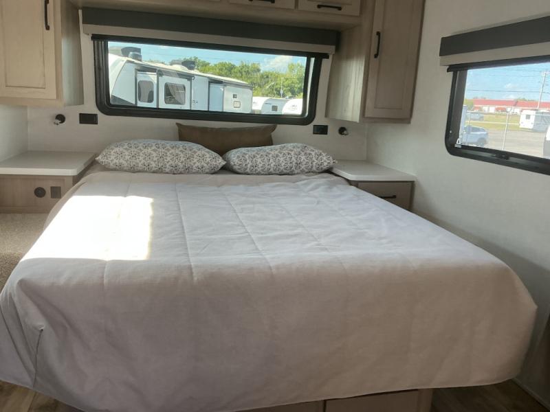 The chef will love cooking in the front kitchen of this travel trailer! It offers plenty of countertop space to meal prep and all of the essentials to cook delicious meals, plus there is even an outside kitchen with a refrigerator, a pull-out stove, and a griddle to fry what you caught that day. Enjoy all of your meals at the 72" sofa slide with a table or pull up a table and chairs under the 15' power awning. The queen bed offers a comfortable place for you to rest up each night and it even has a 26" x 80" flip-up bunk above it for a guest or two to tag along. Store all of your camping essentials in the exterior storage and rinse your feet off with the outside spray port after a fun day at the beach!