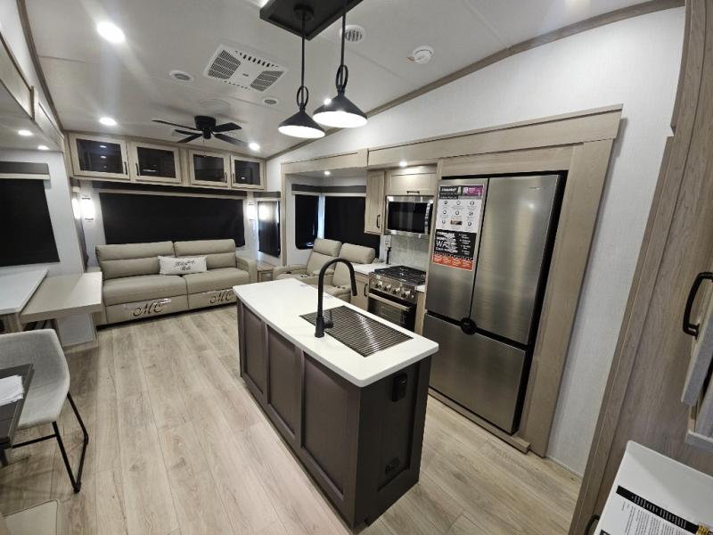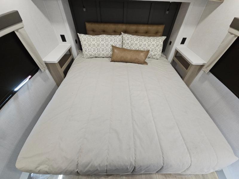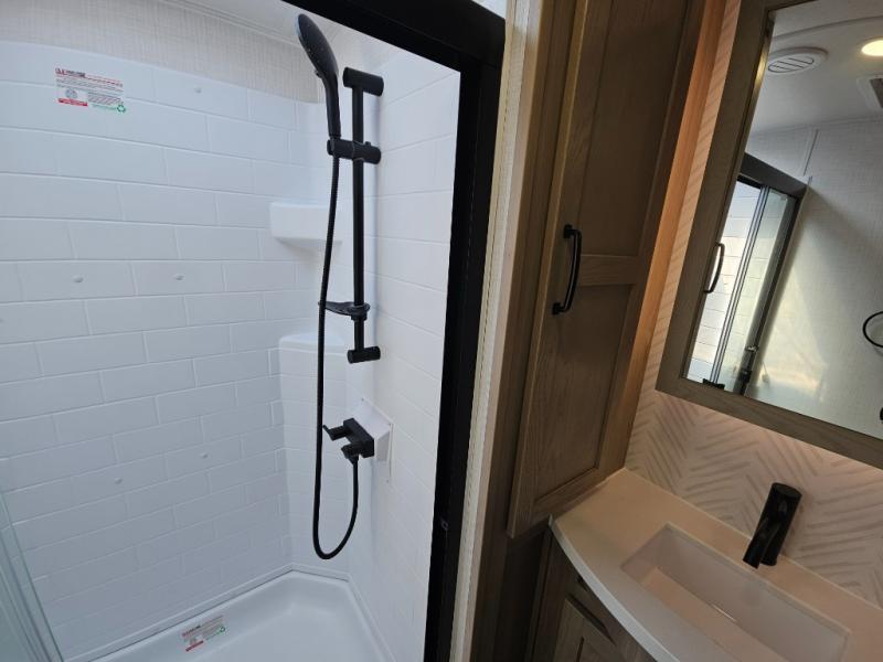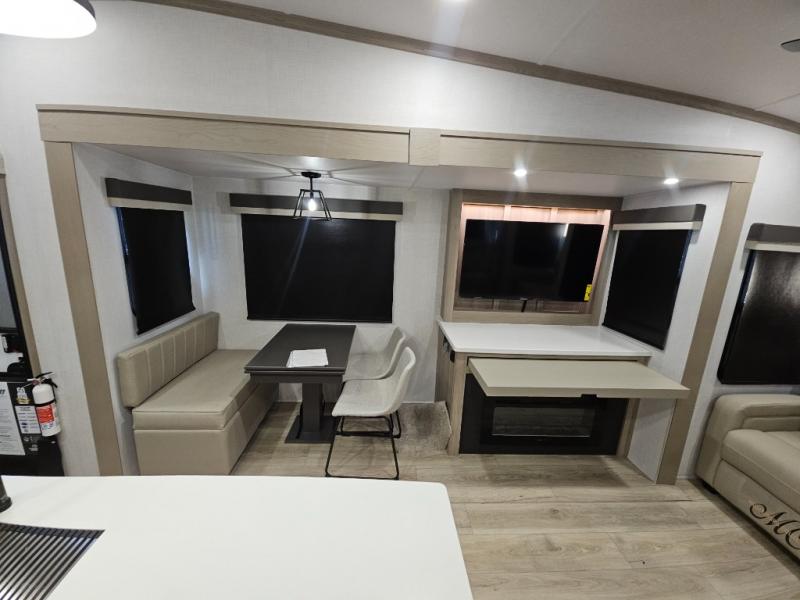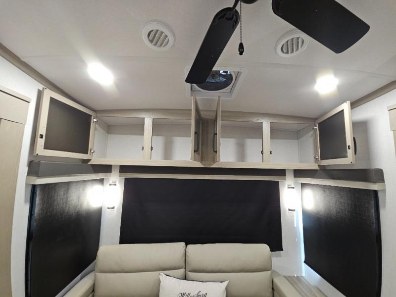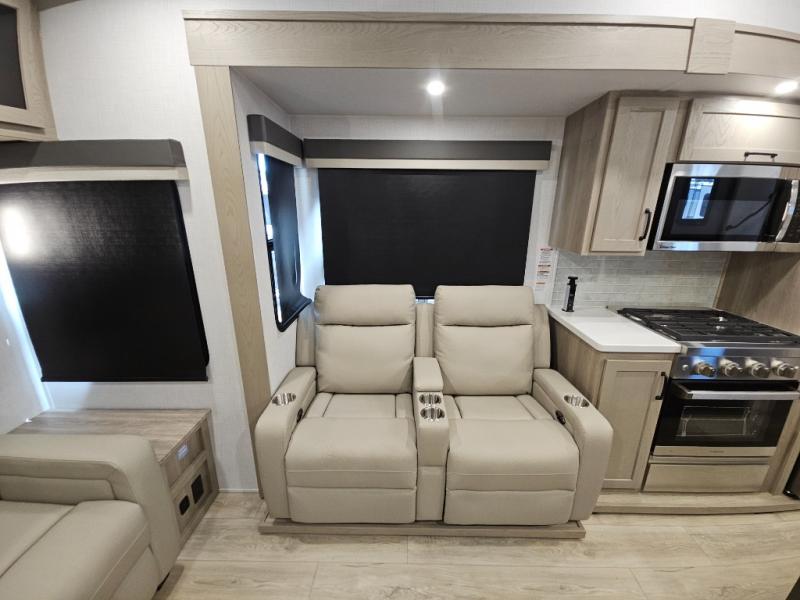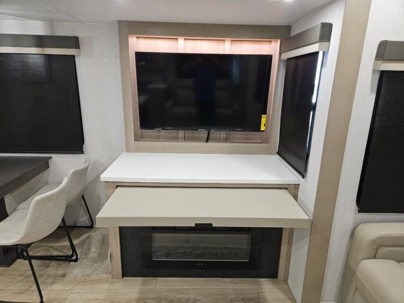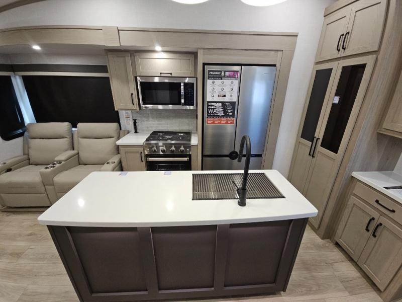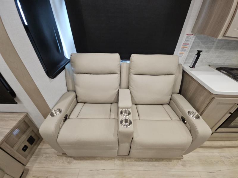 This fifth wheel will feel just like home wherever you decide to roam! The rear living area includes a hide-a-bed sofa with optional recliners, a 60" theater seat across from the TV and fireplace, plus a table and chairs with a bench. There is also a pull-out desk if you need to get some work done in the morning. The spacious full bath with a shower skylight will give you more light as you get ready each morning, and the front private bedroom with a queen bed will provide a great escape each night.