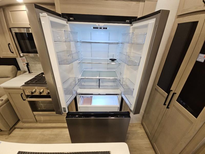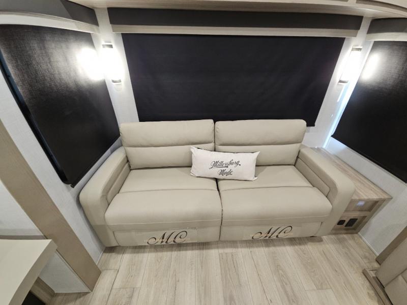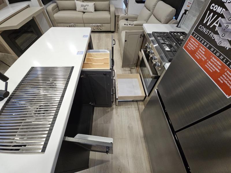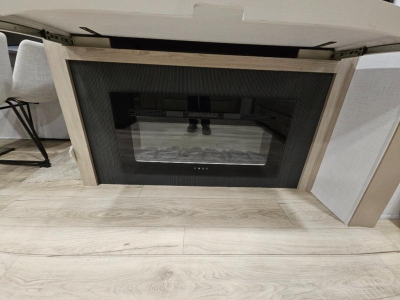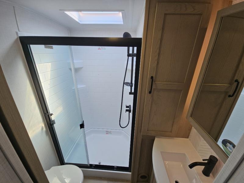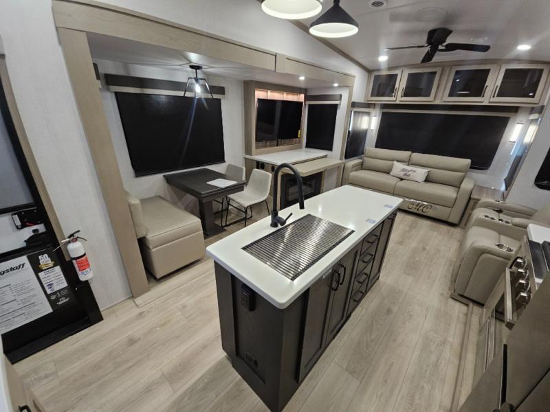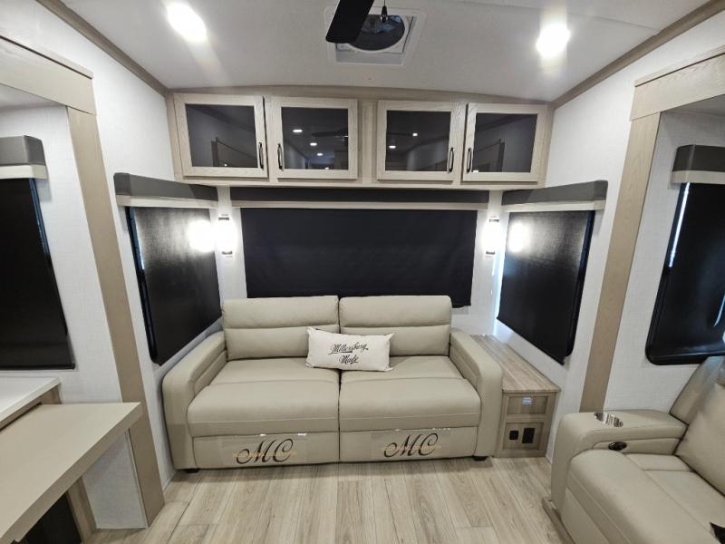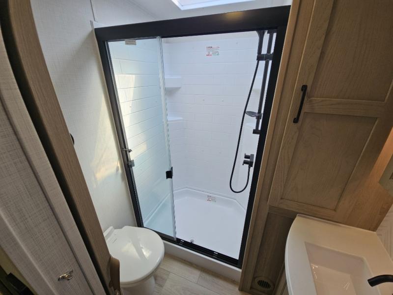 This fifth wheel will feel just like home wherever you decide to roam! The rear living area includes a hide-a-bed sofa with optional recliners, a 60" theater seat across from the TV and fireplace, plus a table and chairs with a bench. There is also a pull-out desk if you need to get some work done in the morning. The spacious full bath with a shower skylight will give you more light as you get ready each morning, and the front private bedroom with a queen bed will provide a great escape each night.