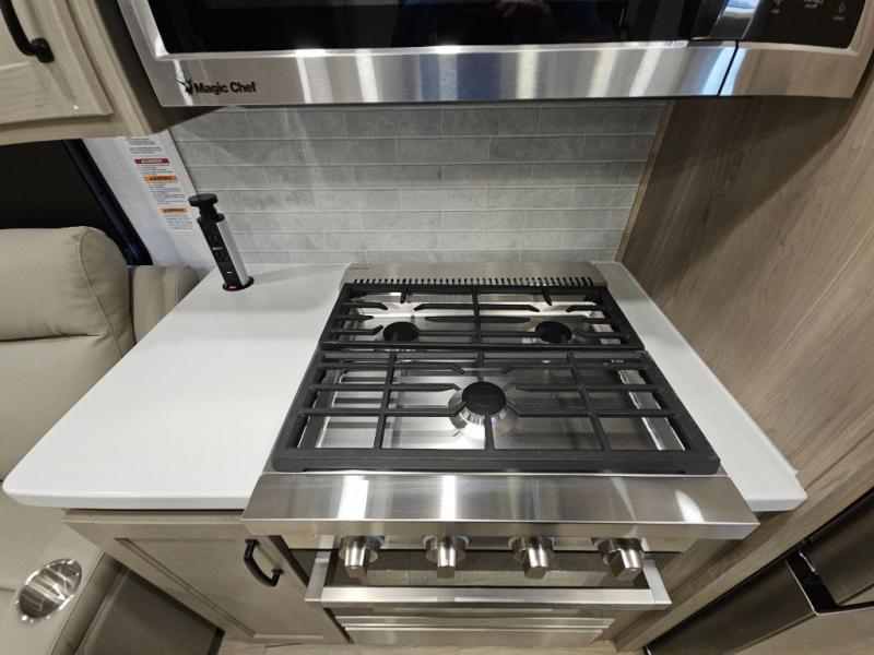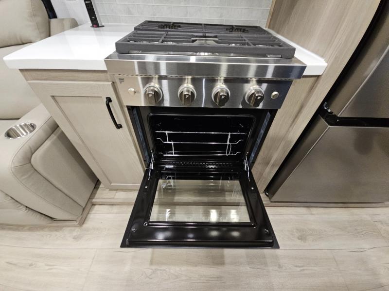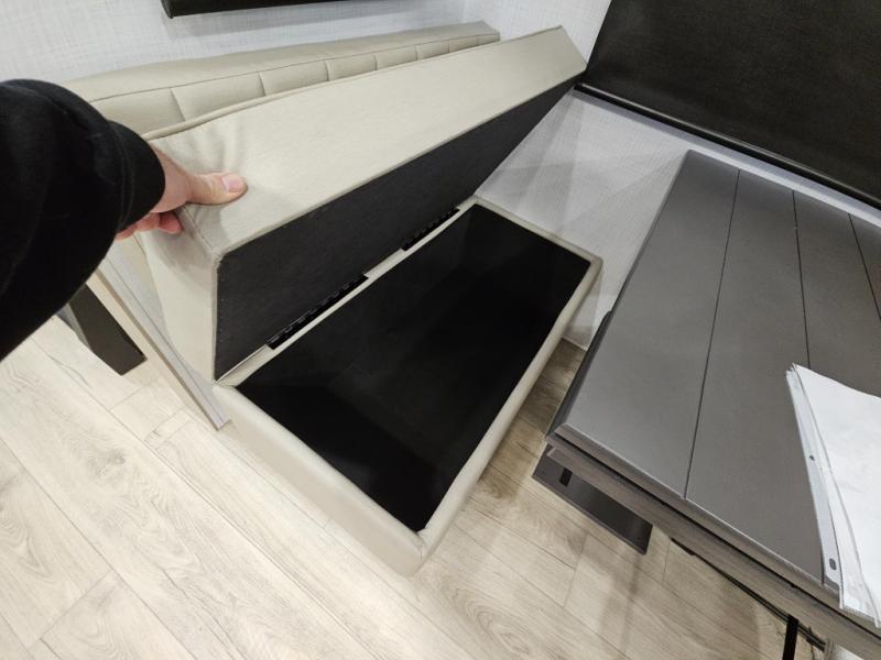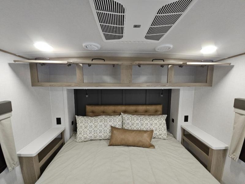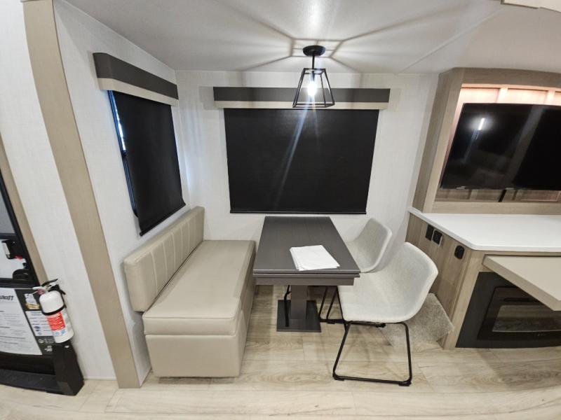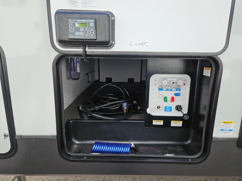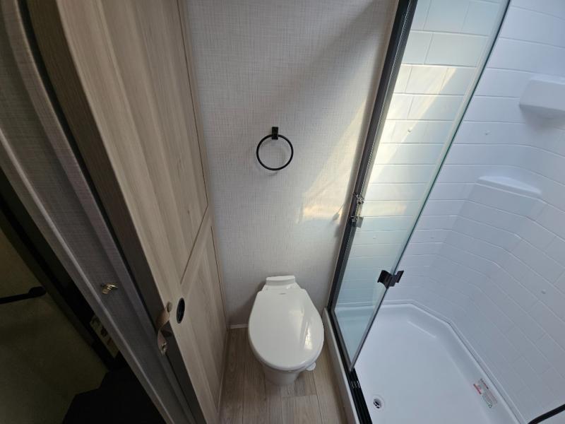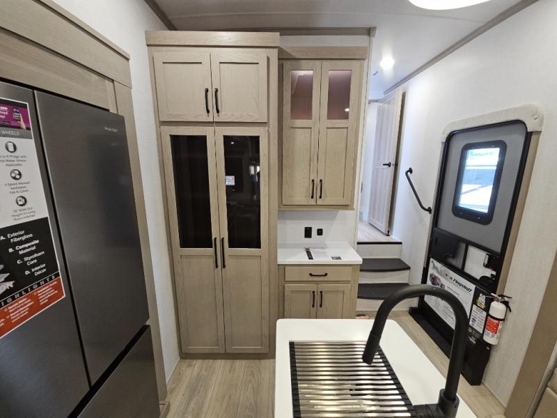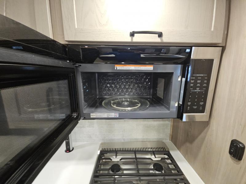 This fifth wheel will feel just like home wherever you decide to roam! The rear living area includes a hide-a-bed sofa with optional recliners, a 60" theater seat across from the TV and fireplace, plus a table and chairs with a bench. There is also a pull-out desk if you need to get some work done in the morning. The spacious full bath with a shower skylight will give you more light as you get ready each morning, and the front private bedroom with a queen bed will provide a great escape each night.