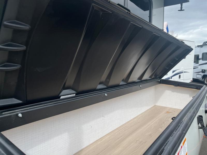 You can keep lots of extra gear stored safely away in the EZ-Reach storage trunks in front and back, plus the additional exterior storage compartment on this A-frame. When you walk in, you will notice a kitchen area up front as well as a 33" x 64" dinette with microwave opposite. The dinette can be used for sleeping for one or two more depending on size. Use the two-burner cooktop to create meals without even preparing a fire, and crank up some tunes on the stereo with exterior speakers to listen to while you prepare dinner. The 1.7 cu. ft. 12V refrigerator with a 100W roof solar panel can store your leftovers for a midnight snack later on or a quick breakfast in the morning.