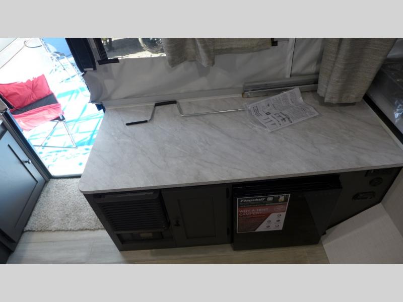 You'll be pleasantly surprised by the amount of comfort in these Flagstaff MAC Series folding pop-up campers by Forest River. Each one is built with a fiberglass laminated roof for added durability and a power roof lift for easy set up. There is also a clay exterior with an alloy band, solar panel prep on the frame, and four stabilizer jacks with sand pads to keep your camper secure. The interior features wood plank flooring, heated mattresses on the bunk ends, USB charging ports, and stylish Andover Sable wood.