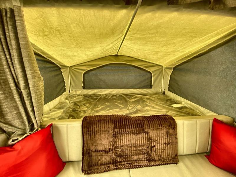 Enjoy time at the campground in this camper that can sleep five to six each night. There is a front 60" x 80" tent end bed, a 48" x 80" rear tent end bed, plus a booth dinette with additional seating and a 15K under bunk A/C. The three burner range will let you make meals each day, and the 12V refrigerator with a 100W roof solar panel will keep your food fresh. This unit also includes storage with a lid your belongings.