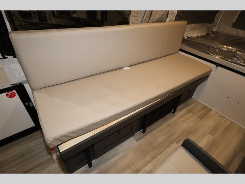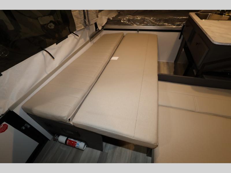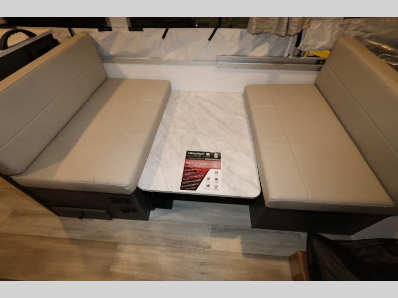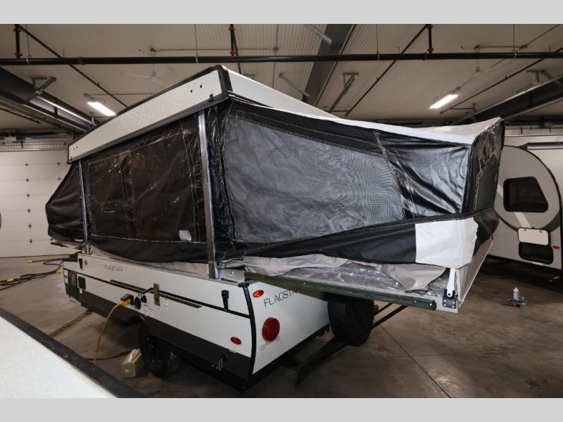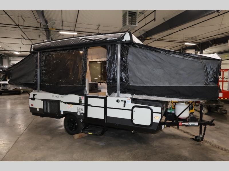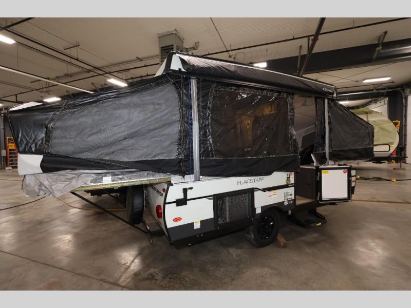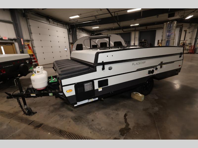 You'll be pleasantly surprised by the amount of comfort in these Flagstaff MAC Series folding pop-up campers by Forest River. Each one is built with a fiberglass laminated roof for added durability and a power roof lift for easy set up. There is also a clay exterior with an alloy band, solar panel prep on the frame, and four stabilizer jacks with sand pads to keep your camper secure. The interior features wood plank flooring, heated mattresses on the bunk ends, USB charging ports, and stylish Andover Sable wood.
