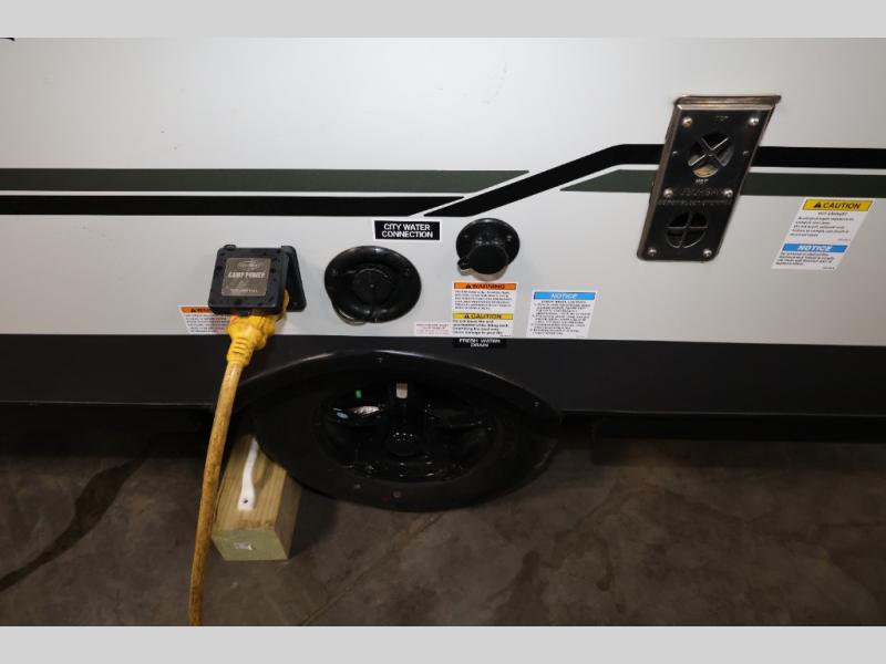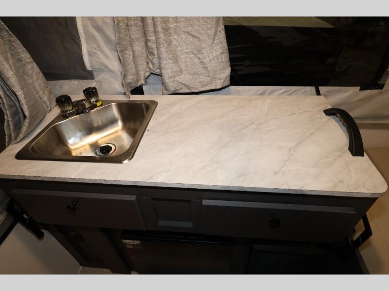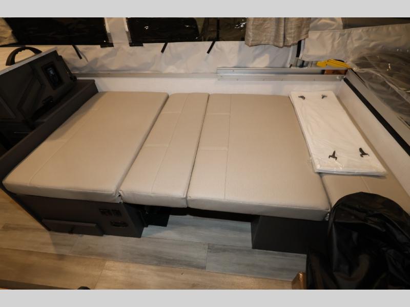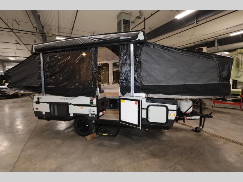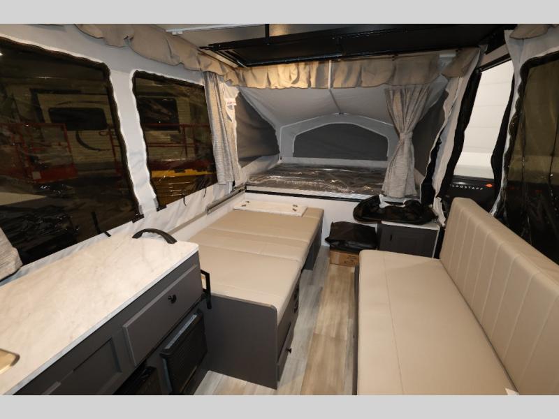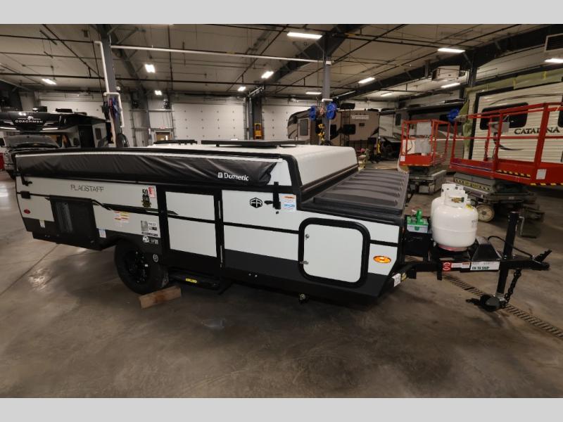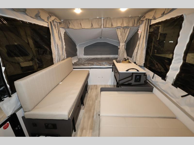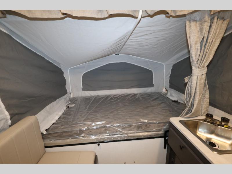 You'll be pleasantly surprised by the amount of comfort in these Flagstaff MAC Series folding pop-up campers by Forest River. Each one is built with a fiberglass laminated roof for added durability and a power roof lift for easy set up. There is also a clay exterior with an alloy band, solar panel prep on the frame, and four stabilizer jacks with sand pads to keep your camper secure. The interior features wood plank flooring, heated mattresses on the bunk ends, USB charging ports, and stylish Andover Sable wood.