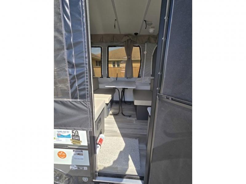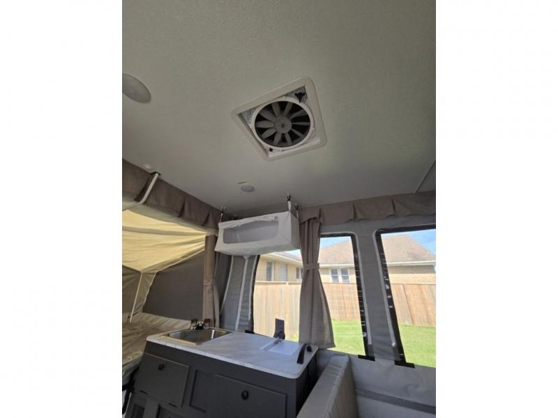 Enjoy time at the campground in this camper that can sleep five to six each night. There is a front 60" x 80" tent end bed, a 48" x 80" rear tent end bed, plus a booth dinette and a gaucho bed. The exterior griddle will let you make meals each day, and the 12V refrigerator with a 100W roof solar panel will keep your food fresh. This unit also includes storage with a lid your belongings.