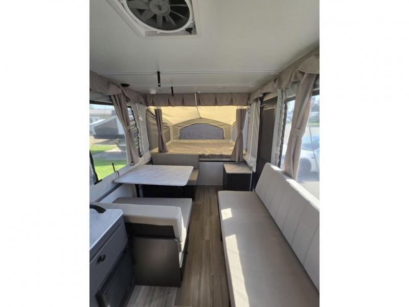 You'll be pleasantly surprised by the amount of comfort in these Flagstaff MAC Series folding pop-up campers by Forest River. Each one is built with a fiberglass laminated roof for added durability and a power roof lift for easy set up. There is also a clay exterior with an alloy band, solar panel prep on the frame, and four stabilizer jacks with sand pads to keep your camper secure. The interior features wood plank flooring, heated mattresses on the bunk ends, USB charging ports, and stylish Andover Sable wood.