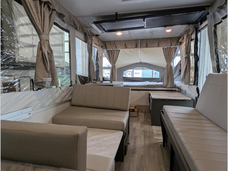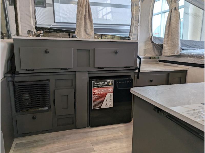 You'll be pleasantly surprised by the amount of comfort in these Flagstaff MAC Series folding pop-up campers by Forest River. Each one is built with a fiberglass laminated roof for added durability and a power roof lift for easy set up. There is also a clay exterior with an alloy band, solar panel prep on the frame, and four stabilizer jacks with sand pads to keep your camper secure. The interior features wood plank flooring, heated mattresses on the bunk ends, USB charging ports, and stylish Andover Sable wood.