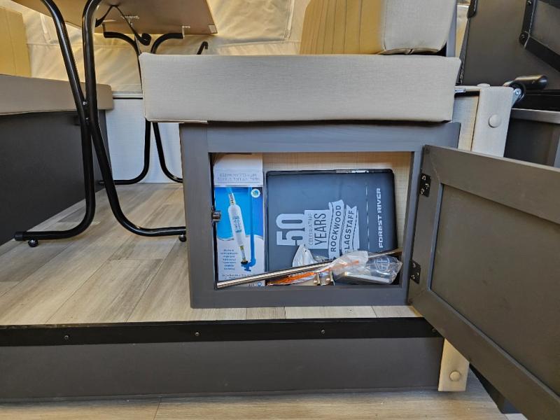 You'll be pleasantly surprised by the amount of comfort in these Flagstaff MAC Series folding pop-up campers by Forest River. Each one is built with a fiberglass laminated roof for added durability and a power roof lift for easy set up. There is also a clay exterior with an alloy band, solar panel prep on the frame, and four stabilizer jacks with sand pads to keep your camper secure. The interior features wood plank flooring, heated mattresses on the bunk ends, USB charging ports, and stylish Andover Sable wood.