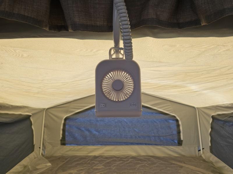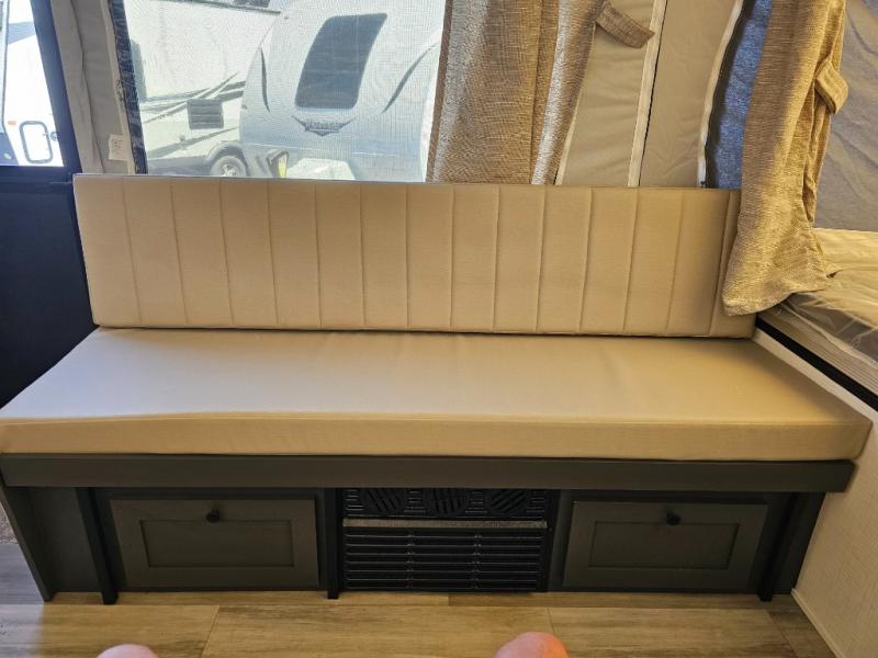 You can't go wrong in this camper with a slide out for more space! You can dine at the booth dinette, relax on the gaucho bed, and enjoy the under bunk A/C. There is also a 70" x 80" front tent end bed and a 60" x 80" rear tent end bed for comfortable sleeping spaces at night. In the morning you can whip up breakfast on the three burner range, put the eggs back in the 12V refrigerator, and easily clean up with the sink!