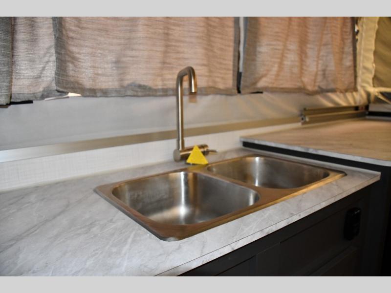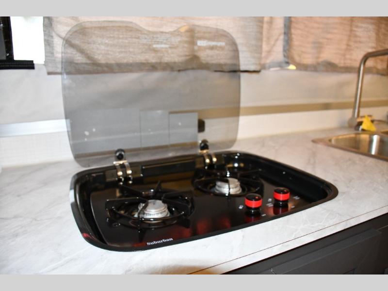Three-burner range, double sink for quick cleanup, and a 12V refrigerator for keeping your fresh food cool on the go. -