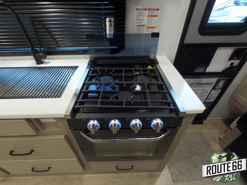 For the couple who is ready to get out and enjoy nature, this Flagstaff Micro Lite travel trailer is ideal for you! This unit has all of the basic amenities, like a rear corner bath with a radius shower, and a front RV queen bed that makes for a comfy night's rest. There is also flip-up storage under the bed to keep luggage, board games, and more! The slide out with the 72" sofa provides extra interior space so that you won't feel cramped. You'll also be able to enjoy your meals here with a table in front of the sofa. After swimming all day working up your appetite, come back to this unit and cook a meal on the three-burner cooktop! This travel trailer features a pass-through storage for your larger camping items, plus an exterior storage to hold the kids' outdoor games and an exterior griddle for breakfast outdoors.