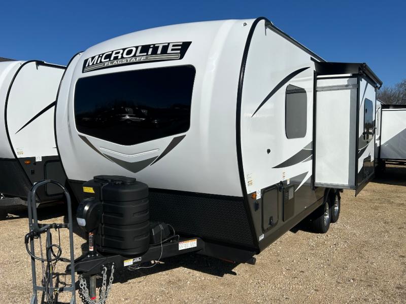 With any Flagstaff Micro Lite travel trailer by Forest River you will enjoy lightweight towing, durable construction, and added interior comforts to make each trip memorable! Each model features a torsion axle, Rubber-Ryde suspension, nitrogen filled, Goodyear Endurance tires, and easy lube axles with Nev-R-Adjust brakes for smooth towing from home to campground. The 6-sided aluminum framed construction provides a strong foundation so you can enjoy your RV for years to come, plus electronically controlled heated holding tanks and an enclosed underbelly will let you camp all year long. Head inside to find hybrid woven flooring in the slide outs, Sedona wood cabinetry, solid surface kitchen countertops, and many more amenities. These travel trailers also include exterior conveniences for hassle-free camping, like the power tongue jack, magnetic compartment door catches, Keyed Alike locks, and rear ladder to name a few!