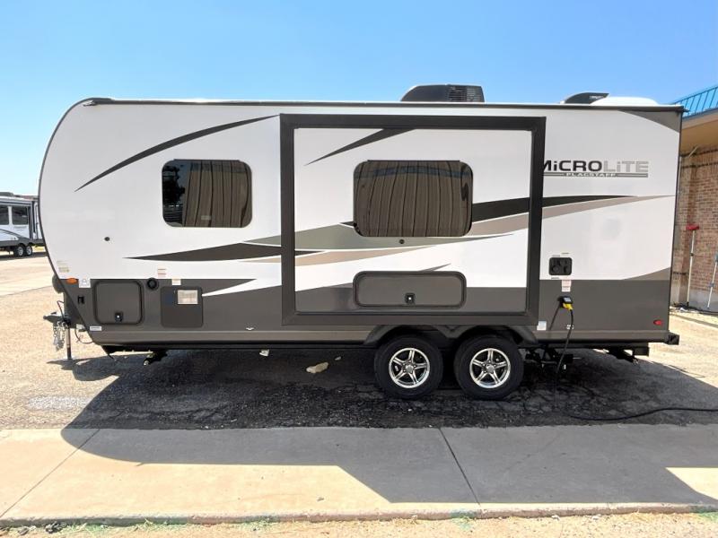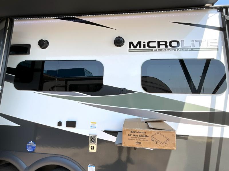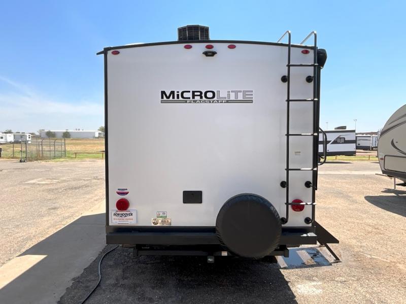 With any Flagstaff Micro Lite travel trailer by Forest River you will enjoy lightweight towing, durable construction, and added interior comforts to make each trip memorable! Each model features a torsion axle, Rubber-Ryde suspension, nitrogen filled, Goodyear Endurance tires, and easy lube axles with Nev-R-Adjust brakes for smooth towing from home to campground. The 6-sided aluminum framed construction provides a strong foundation so you can enjoy your RV for years to come, plus electronically controlled heated holding tanks and an enclosed underbelly will let you camp all year long. Head inside to find hybrid woven flooring in the slide outs, Sedona wood cabinetry, solid surface kitchen countertops, and many more amenities. These travel trailers also include exterior conveniences for hassle-free camping, like the power tongue jack, magnetic compartment door catches, Keyed Alike locks, and rear ladder to name a few!