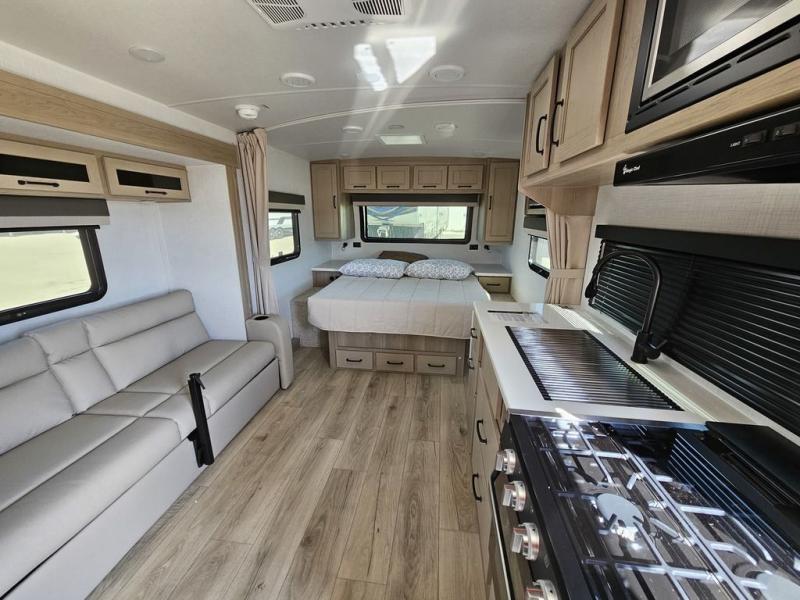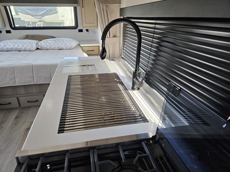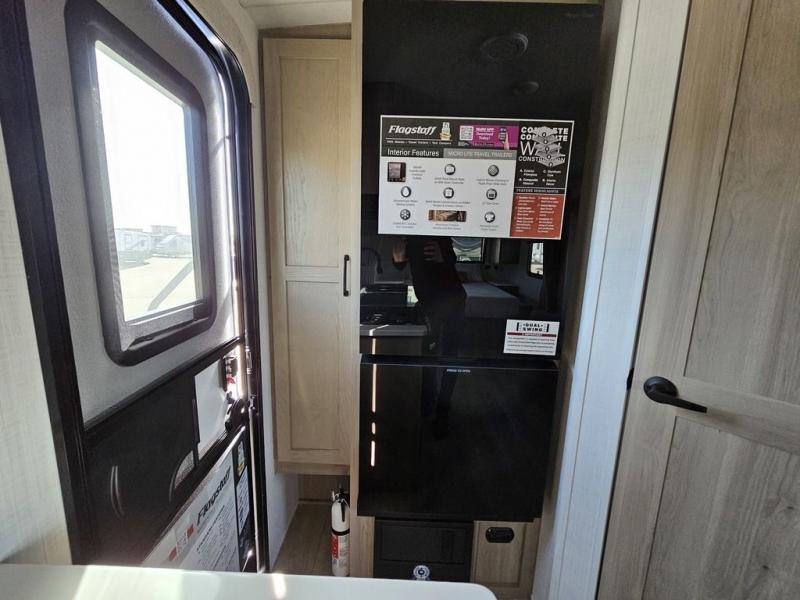 With any Flagstaff Micro Lite travel trailer by Forest River you will enjoy lightweight towing, durable construction, and added interior comforts to make each trip memorable! Each model features a torsion axle, Rubber-Ryde suspension, nitrogen filled, Goodyear Endurance tires, and easy lube axles with Nev-R-Adjust brakes for smooth towing from home to campground. The 6-sided aluminum framed construction provides a strong foundation so you can enjoy your RV for years to come, plus electronically controlled heated holding tanks and an enclosed underbelly will let you camp all year long. Head inside to find hybrid woven flooring in the slide outs, Sedona wood cabinetry, solid surface kitchen countertops, and many more amenities. These travel trailers also include exterior conveniences for hassle-free camping, like the power tongue jack, magnetic compartment door catches, Keyed Alike locks, and rear ladder to name a few!
