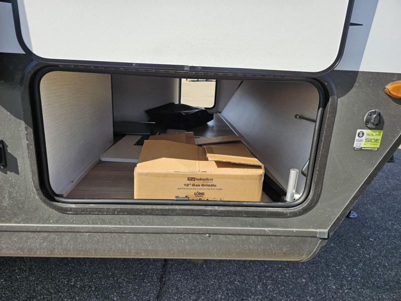 For the couple who is ready to get out and enjoy nature, this Flagstaff Micro Lite travel trailer is ideal for you! This unit has all of the basic amenities, like a rear corner bath with a radius shower, and a front RV queen bed that makes for a comfy night's rest. There is also flip-up storage under the bed to keep luggage, board games, and more! The slide out with the 72" sofa provides extra interior space so that you won't feel cramped. You'll also be able to enjoy your meals here with a table in front of the sofa. After swimming all day working up your appetite, come back to this unit and cook a meal on the three-burner cooktop! This travel trailer features a pass-through storage for your larger camping items, plus an exterior storage to hold the kids' outdoor games and an exterior griddle for breakfast outdoors.