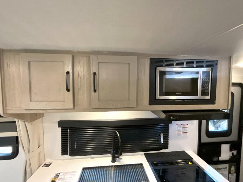 With any Flagstaff Micro Lite travel trailer by Forest River you will enjoy lightweight towing, durable construction, and added interior comforts to make each trip memorable! Each model features a torsion axle, Rubber-Ryde suspension, nitrogen filled, Goodyear Endurance tires, and easy lube axles with Nev-R-Adjust brakes for smooth towing from home to campground. The 6-sided aluminum framed construction provides a strong foundation so you can enjoy your RV for years to come, plus electronically controlled heated holding tanks and an enclosed underbelly will let you camp all year long. Head inside to find hybrid woven flooring in the slide outs, Sedona wood cabinetry, solid surface kitchen countertops, and many more amenities. These travel trailers also include exterior conveniences for hassle-free camping, like the power tongue jack, magnetic compartment door catches, Keyed Alike locks, and rear ladder to name a few!