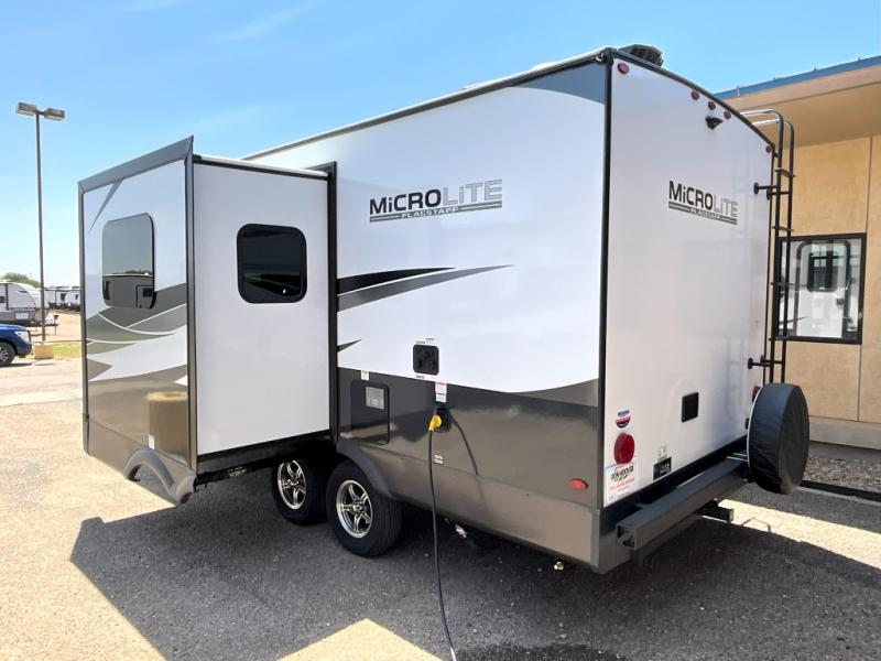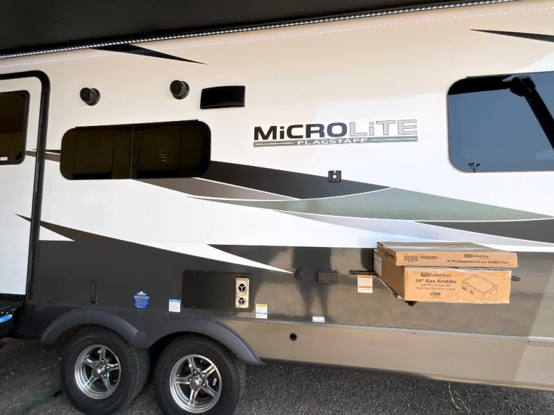 With any Flagstaff Micro Lite travel trailer by Forest River you will enjoy lightweight towing, durable construction, and added interior comforts to make each trip memorable! Each model features a torsion axle, Rubber-Ryde suspension, nitrogen filled, Goodyear Endurance tires, and easy lube axles with Nev-R-Adjust brakes for smooth towing from home to campground. The 6-sided aluminum framed construction provides a strong foundation so you can enjoy your RV for years to come, plus electronically controlled heated holding tanks and an enclosed underbelly will let you camp all year long. Head inside to find hybrid woven flooring in the slide outs, Sedona wood cabinetry, solid surface kitchen countertops, and many more amenities. These travel trailers also include exterior conveniences for hassle-free camping, like the power tongue jack, magnetic compartment door catches, Keyed Alike locks, and rear ladder to name a few!