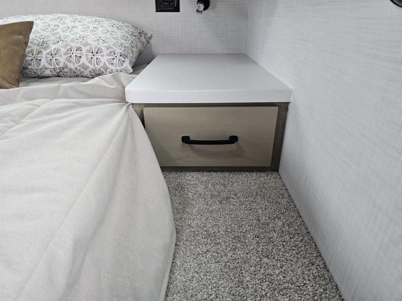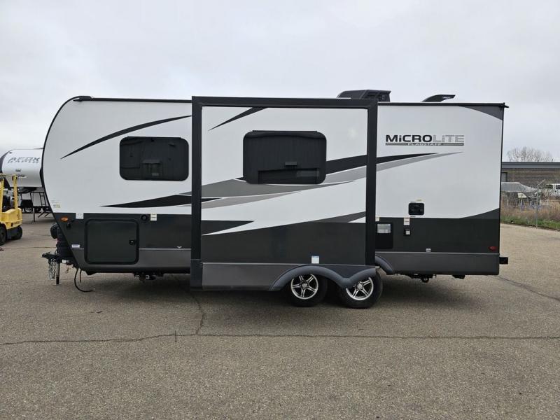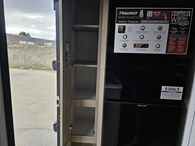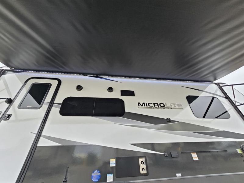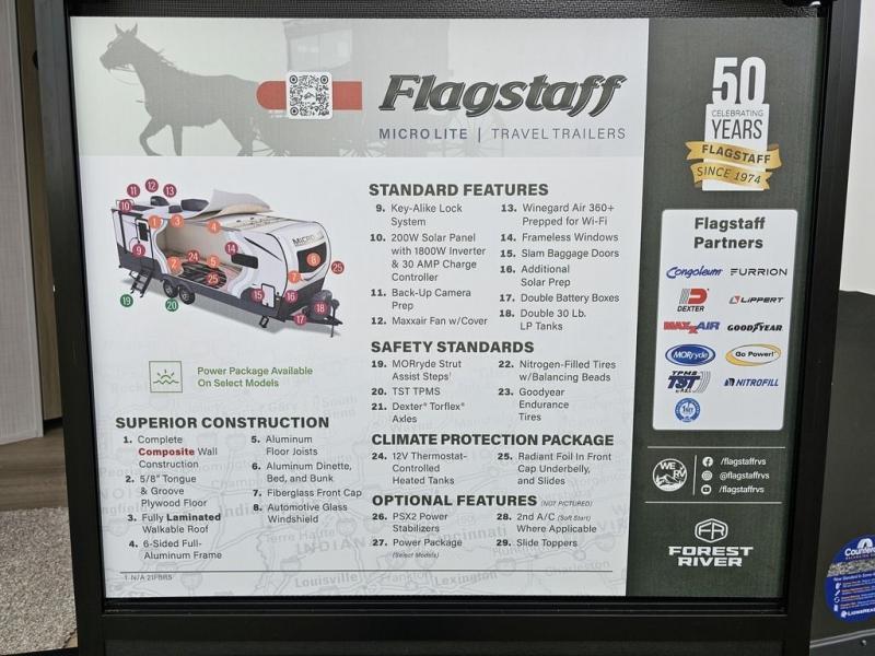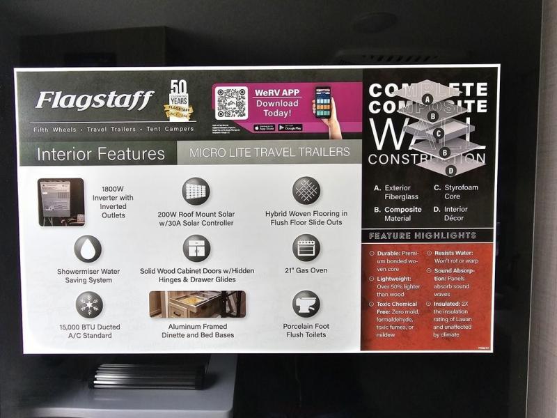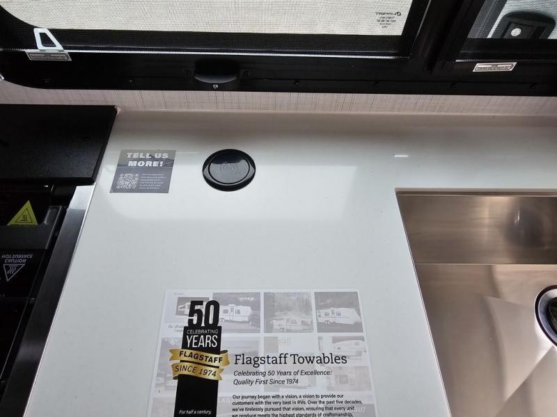 With any Flagstaff Micro Lite travel trailer by Forest River you will enjoy lightweight towing, durable construction, and added interior comforts to make each trip memorable! Each model features a torsion axle, Rubber-Ryde suspension, nitrogen filled, Goodyear Endurance tires, and easy lube axles with Nev-R-Adjust brakes for smooth towing from home to campground. The 6-sided aluminum framed construction provides a strong foundation so you can enjoy your RV for years to come, plus electronically controlled heated holding tanks and an enclosed underbelly will let you camp all year long. Head inside to find hybrid woven flooring in the slide outs, Sedona wood cabinetry, solid surface kitchen countertops, and many more amenities. These travel trailers also include exterior conveniences for hassle-free camping, like the power tongue jack, magnetic compartment door catches, Keyed Alike locks, and rear ladder to name a few!