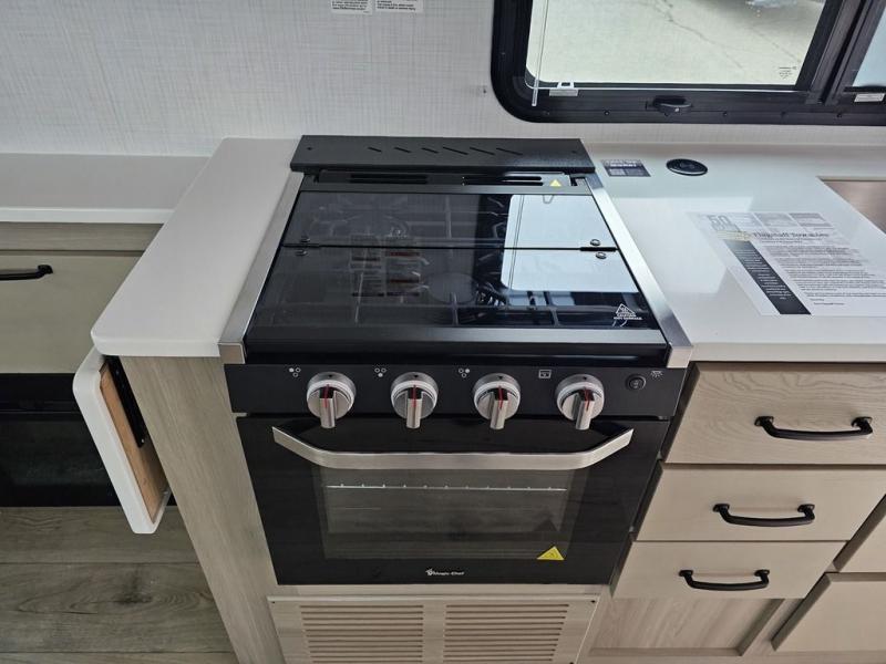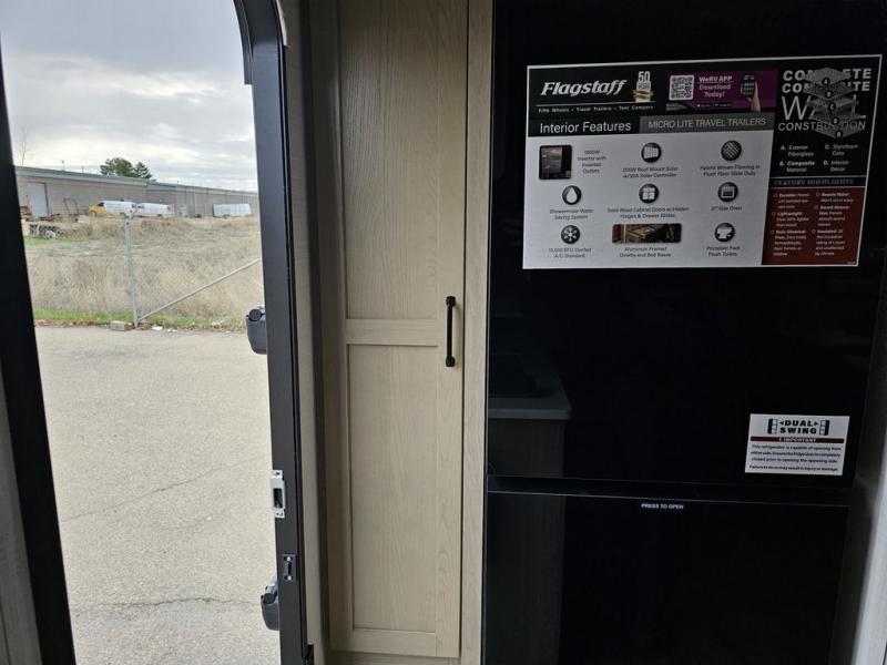 Make your vacations everything you've always wanted them to be with this Flagstaff Micro Lite travel trailer! A full bathroom with a radius shower, linen closet, and skylight will allow you to stay clean without having to find a public rest stop. There is also a three-burner range, a gas oven, and a 12 volt refrigerator that will allow you to eat more than just fast food while you are away from home. You can even sleep just as comfortably as you do at home because the queen-size bed up front will provide peaceful dreams each and every night, and more features that will allow you to go off-grid when the adventure calls for it!