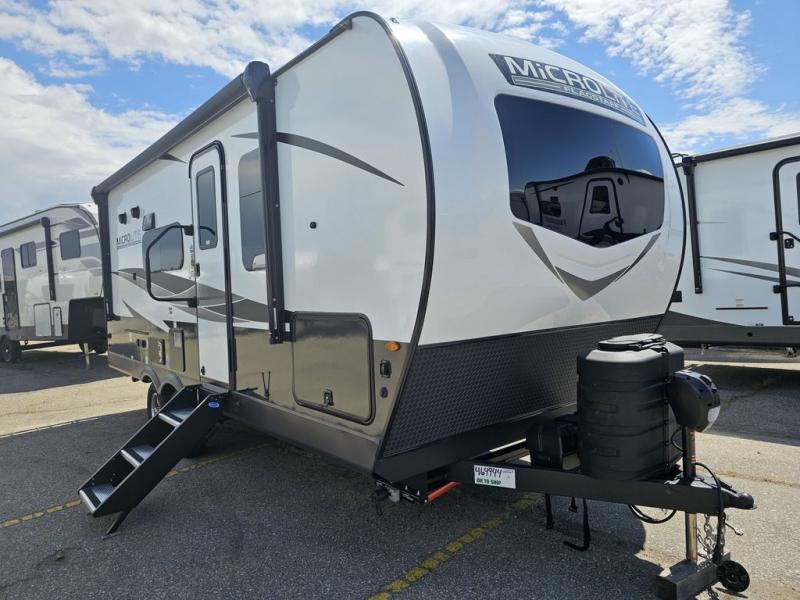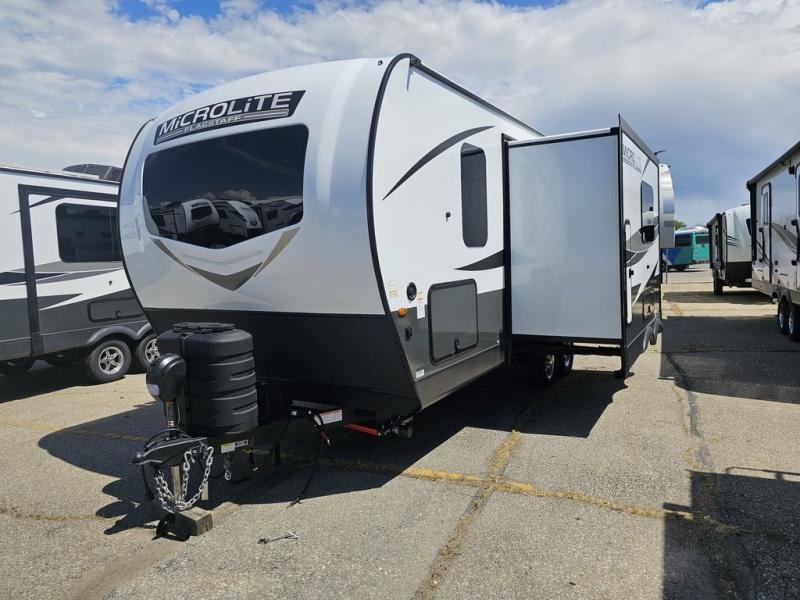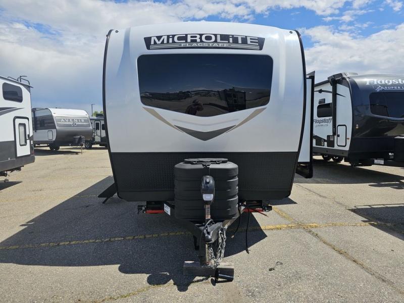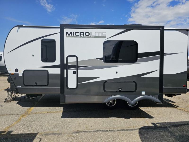With any Flagstaff Micro Lite travel trailer by Forest River you will enjoy lightweight towing, durable construction, and added interior comforts to make each trip memorable! Each model features a torsion axle, Rubber-Ryde suspension, nitrogen filled, Goodyear Endurance tires, and easy lube axles with Nev-R-Adjust brakes for smooth towing from home to campground. The 6-sided aluminum framed construction provides a strong foundation so you can enjoy your RV for years to come, plus electronically controlled heated holding tanks and an enclosed underbelly will let you camp all year long. Head inside to find hybrid woven flooring in the slide outs, Sedona wood cabinetry, solid surface kitchen countertops, and many more amenities. These travel trailers also include exterior conveniences for hassle-free camping, like the power tongue jack, magnetic compartment door catches, Keyed Alike locks, and rear ladder to name a few!