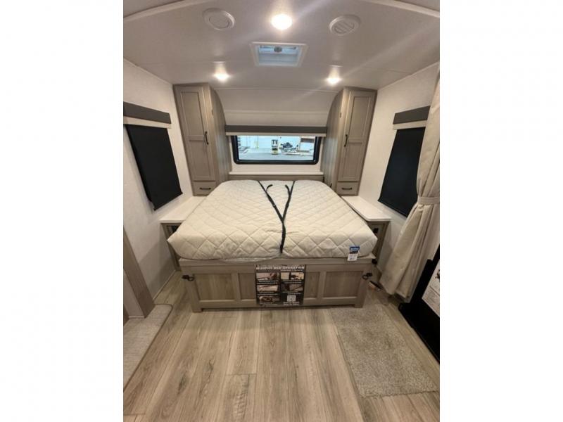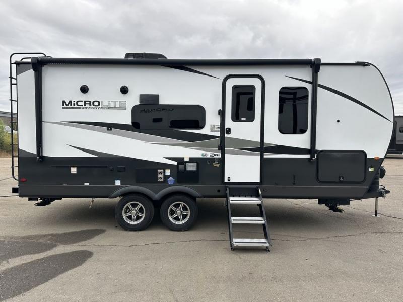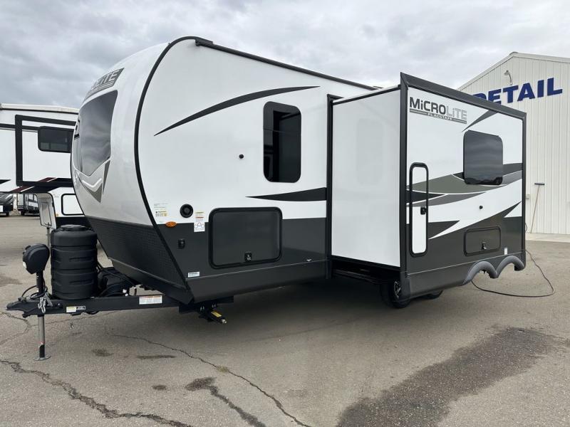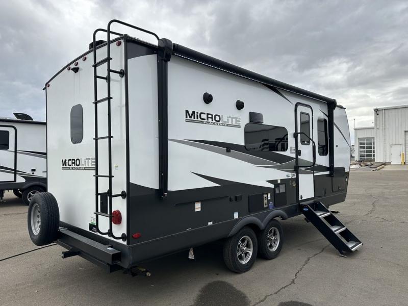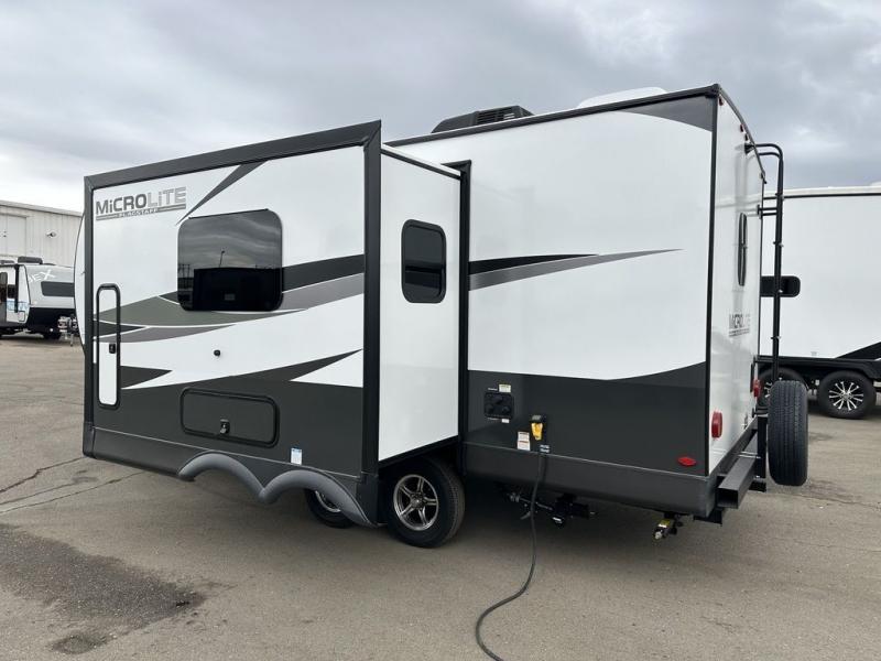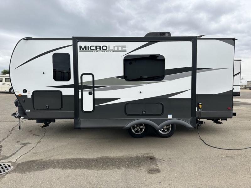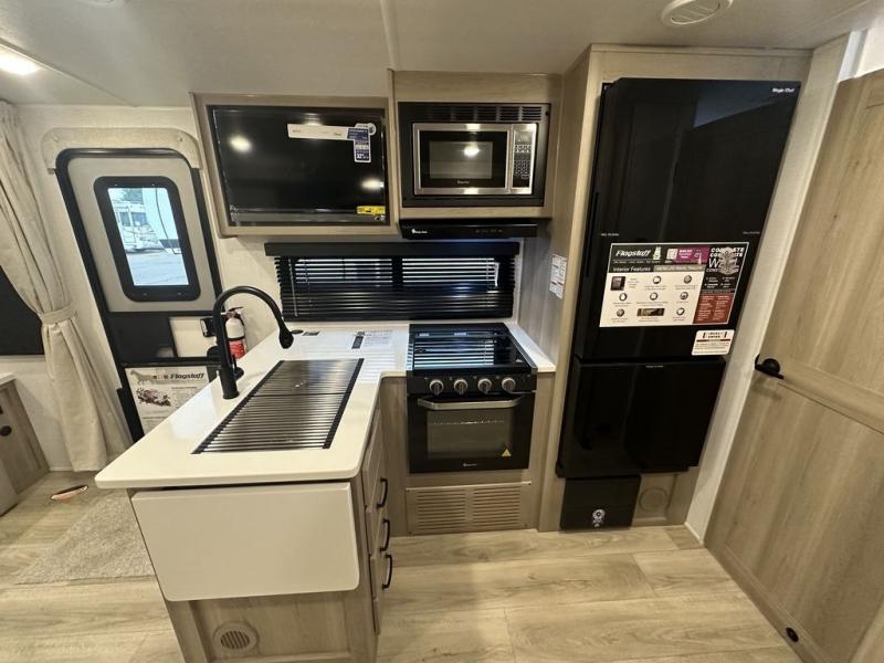 With any Flagstaff Micro Lite travel trailer by Forest River you will enjoy lightweight towing, durable construction, and added interior comforts to make each trip memorable! Each model features a torsion axle, Rubber-Ryde suspension, nitrogen filled, Goodyear Endurance tires, and easy lube axles with Nev-R-Adjust brakes for smooth towing from home to campground. The 6-sided aluminum framed construction provides a strong foundation so you can enjoy your RV for years to come, plus electronically controlled heated holding tanks and an enclosed underbelly will let you camp all year long. Head inside to find hybrid woven flooring in the slide outs, Sedona wood cabinetry, solid surface kitchen countertops, and many more amenities. These travel trailers also include exterior conveniences for hassle-free camping, like the power tongue jack, magnetic compartment door catches, Keyed Alike locks, and rear ladder to name a few!