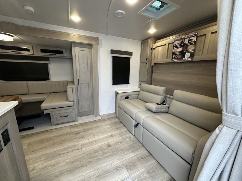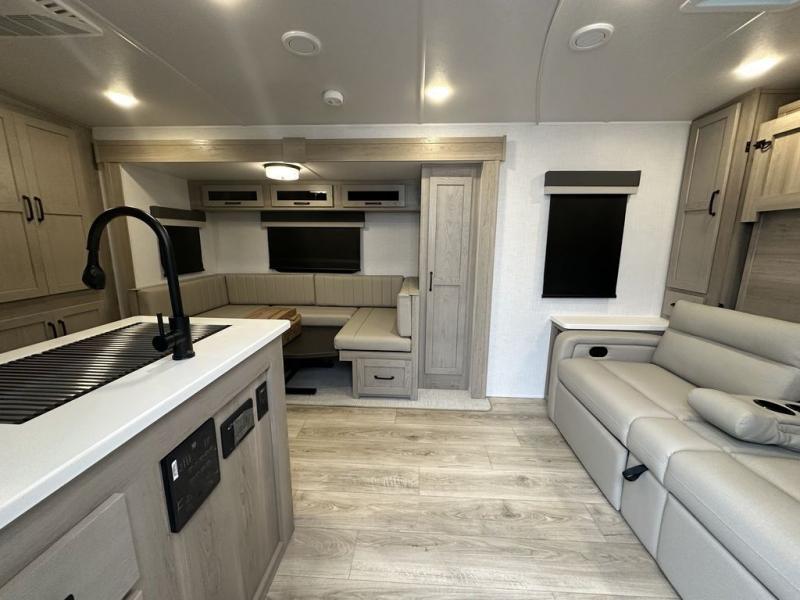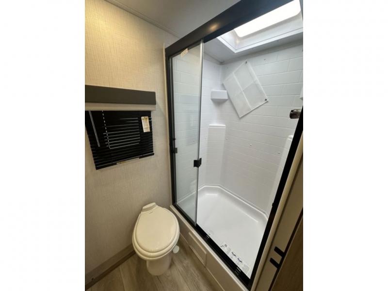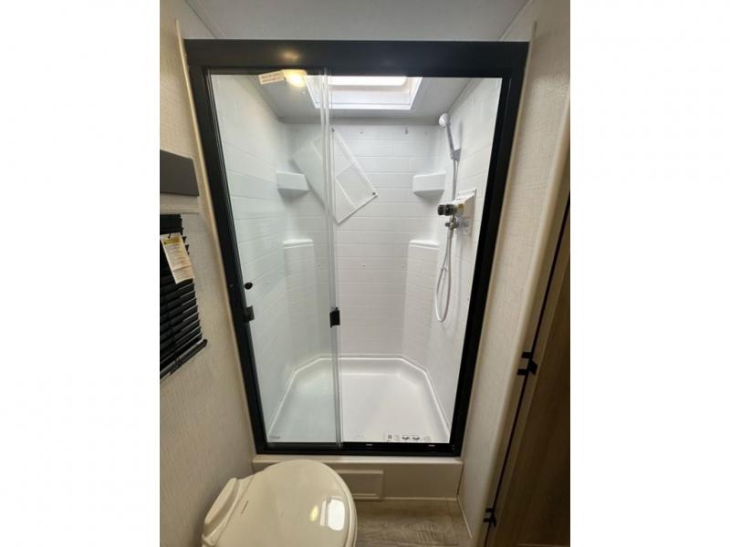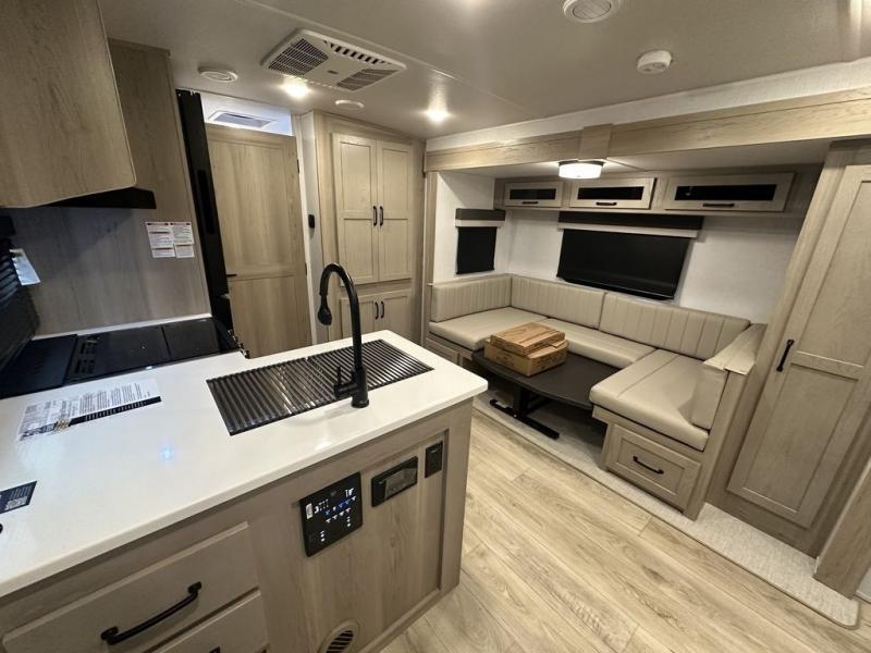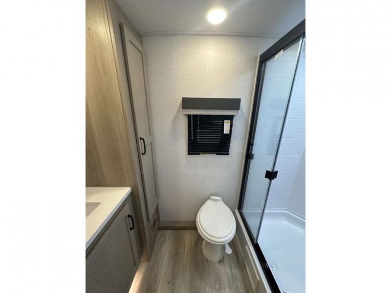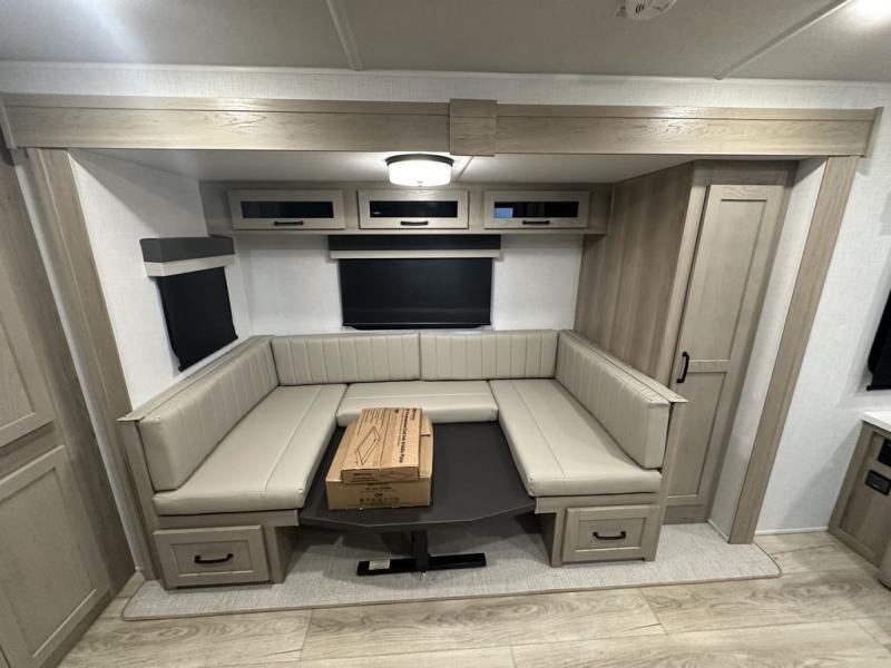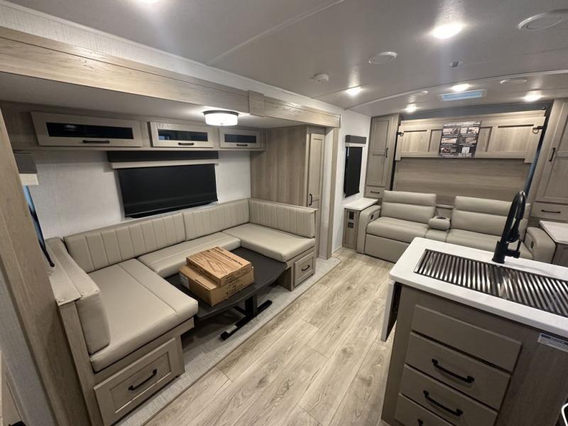 Not only does this travel trailer include an exterior griddle, but also a full interior kitchen with a countertop extension for more prep space and a pantry for snacks! Up front, you'll find the 74" sofa where you can relax each day, then fold down the Murphy bed in the evening for a great night's rest. There is also a privacy curtain here if you have guests staying over on the U-shaped dinette within the slide out, and the 32" TV means you all can watch a movie at night. The full rear bath includes a spacious shower to freshen up, along with a toilet, sink, and bath linen closet for towels!