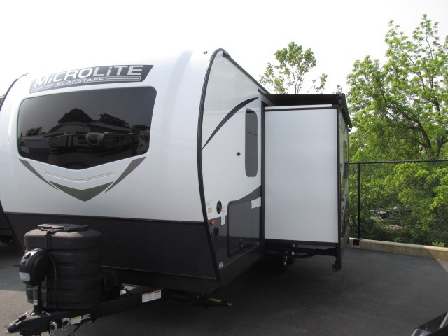 With any Flagstaff Micro Lite travel trailer by Forest River you will enjoy lightweight towing, durable construction, and added interior comforts to make each trip memorable! Each model features a torsion axle, Rubber-Ryde suspension, nitrogen filled, Goodyear Endurance tires, and easy lube axles with Nev-R-Adjust brakes for smooth towing from home to campground. The 6-sided aluminum framed construction provides a strong foundation so you can enjoy your RV for years to come, plus electronically controlled heated holding tanks and an enclosed underbelly will let you camp all year long. Head inside to find hybrid woven flooring in the slide outs, Sedona wood cabinetry, solid surface kitchen countertops, and many more amenities. These travel trailers also include exterior conveniences for hassle-free camping, like the power tongue jack, magnetic compartment door catches, Keyed Alike locks, and rear ladder to name a few!